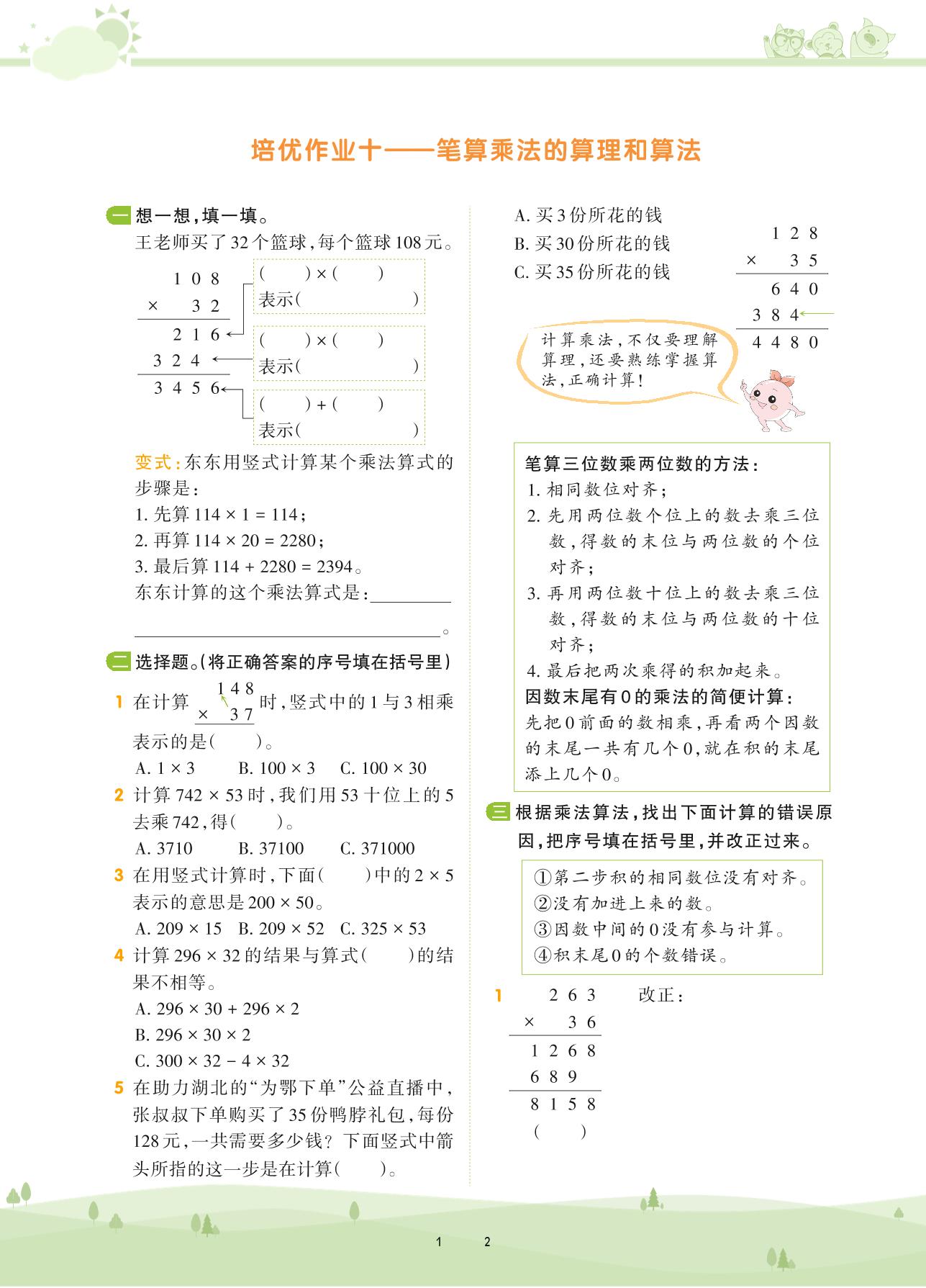 2020上册四年级数学人教版 第四单元 三位数乘两位数——培优作业十——笔算乘法的算理和算法