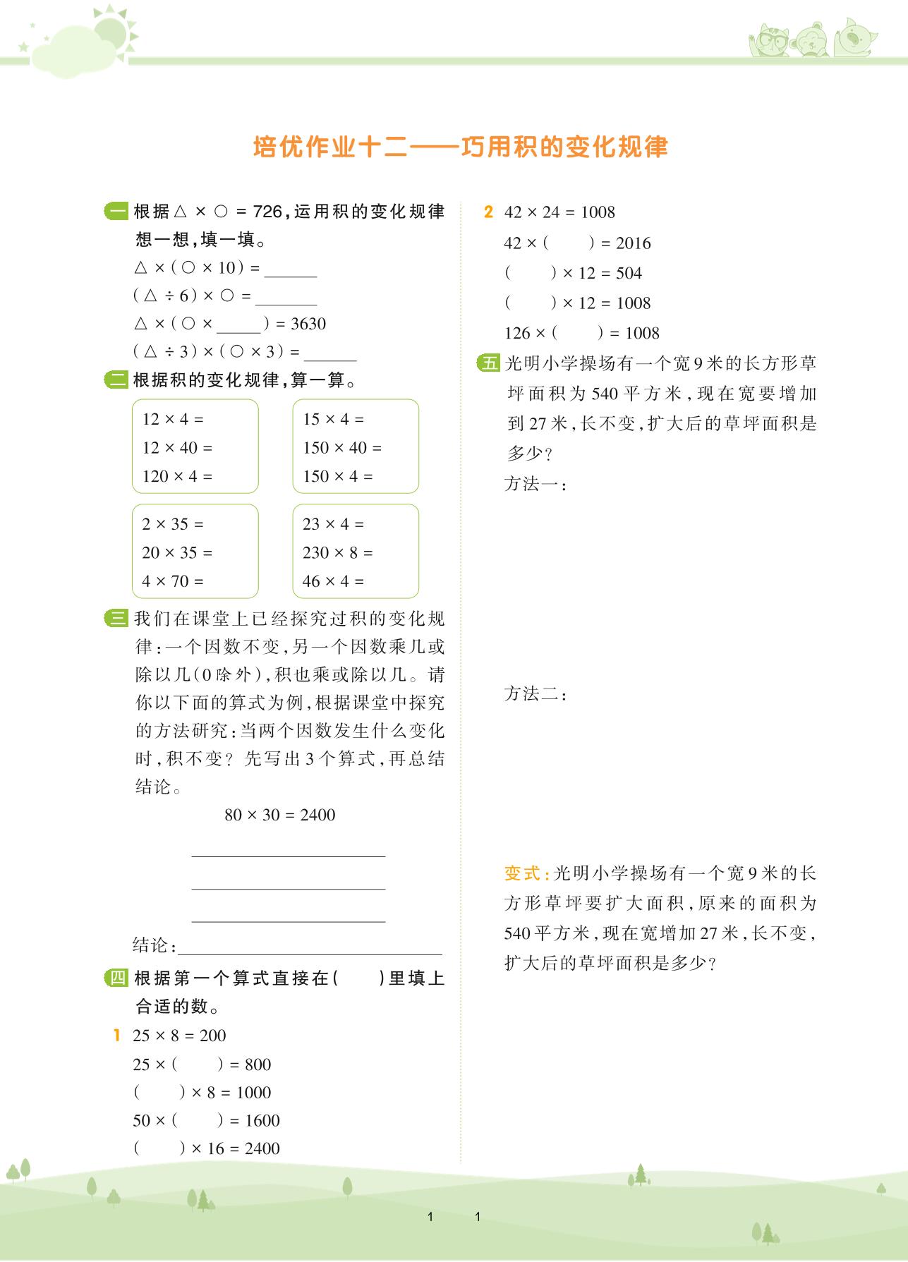 2020上册四年级数学人教版 第四单元 三位数乘两位数——培优作业十二——巧用积的变化规律