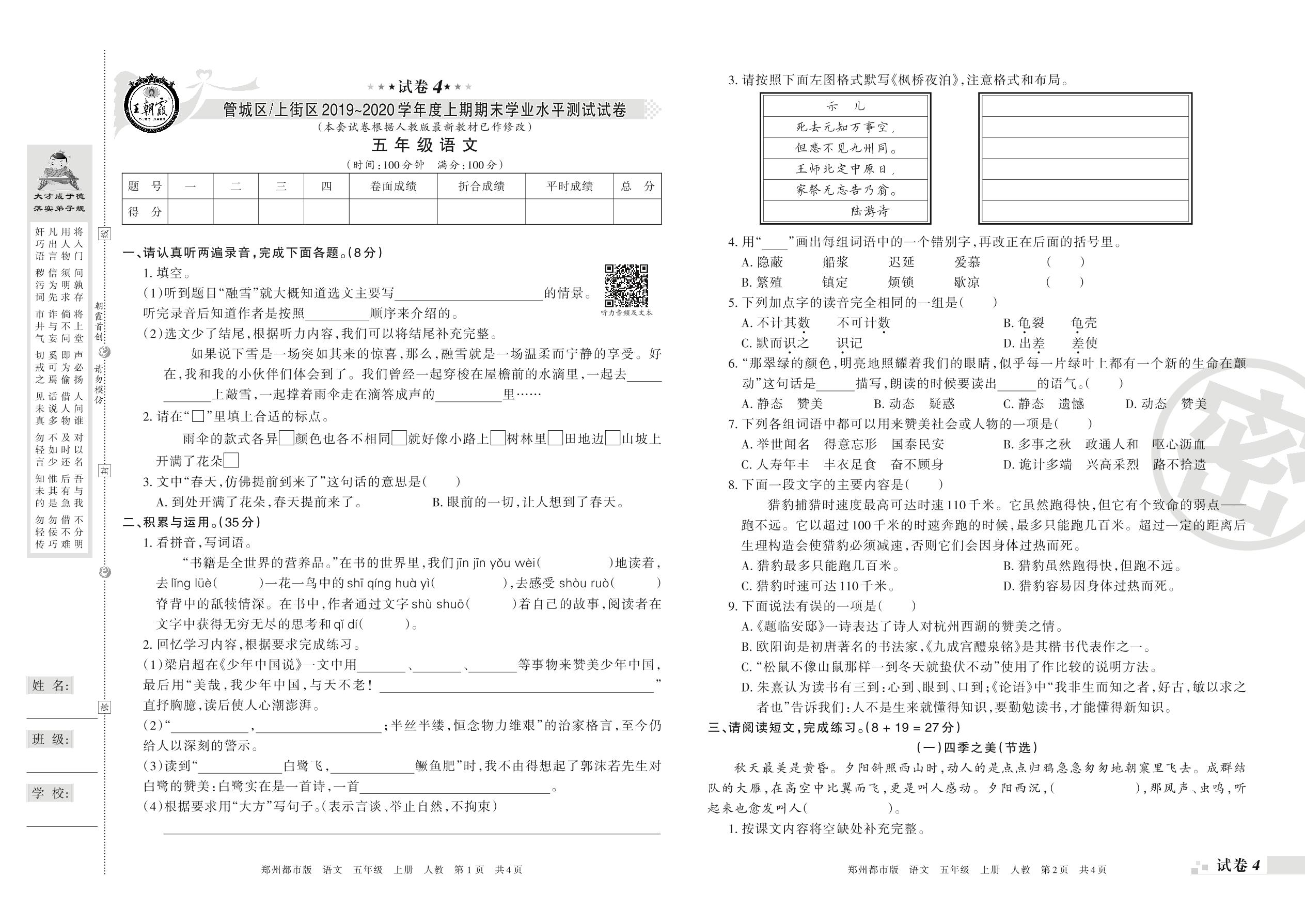 2019-2020学年第一学期郑州市管城区、上街区五年级语文试卷(人教版)【4】