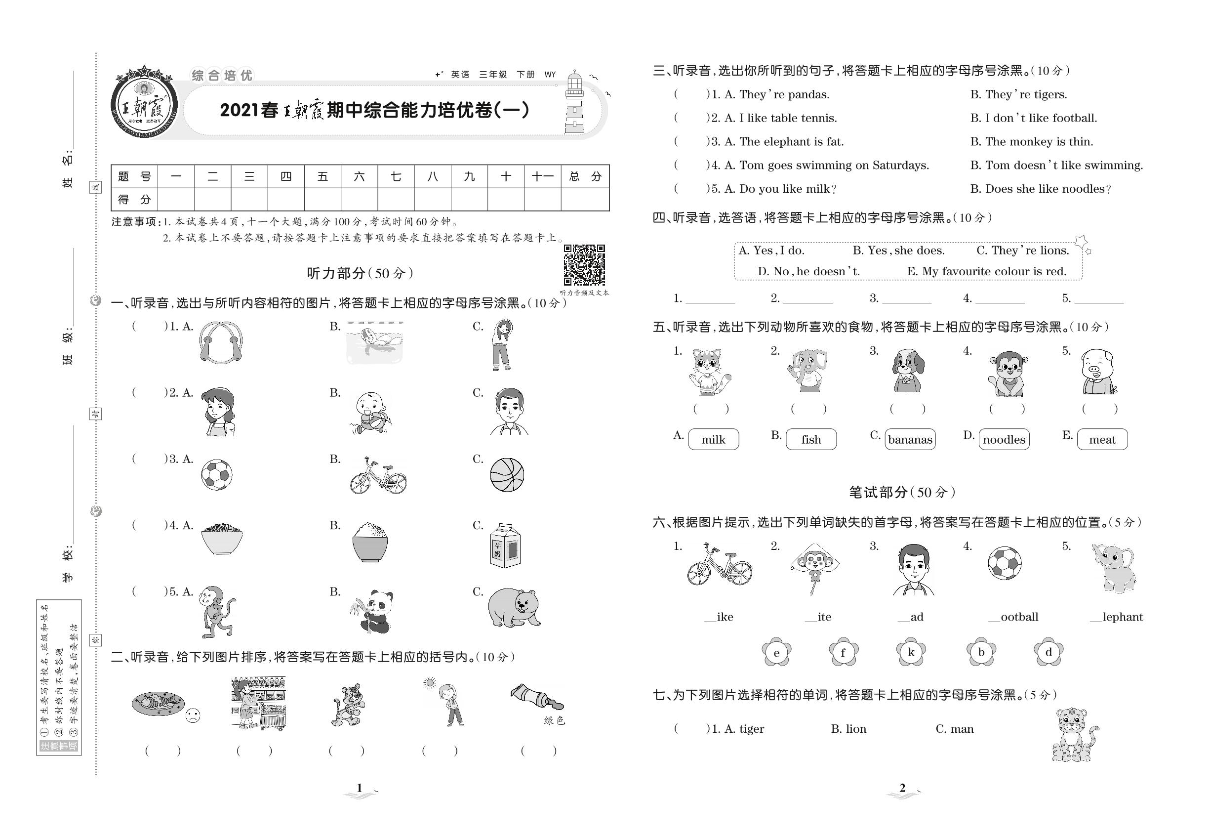 2021下册三年级英语外研版 王朝霞期中综合能力培优卷(一)