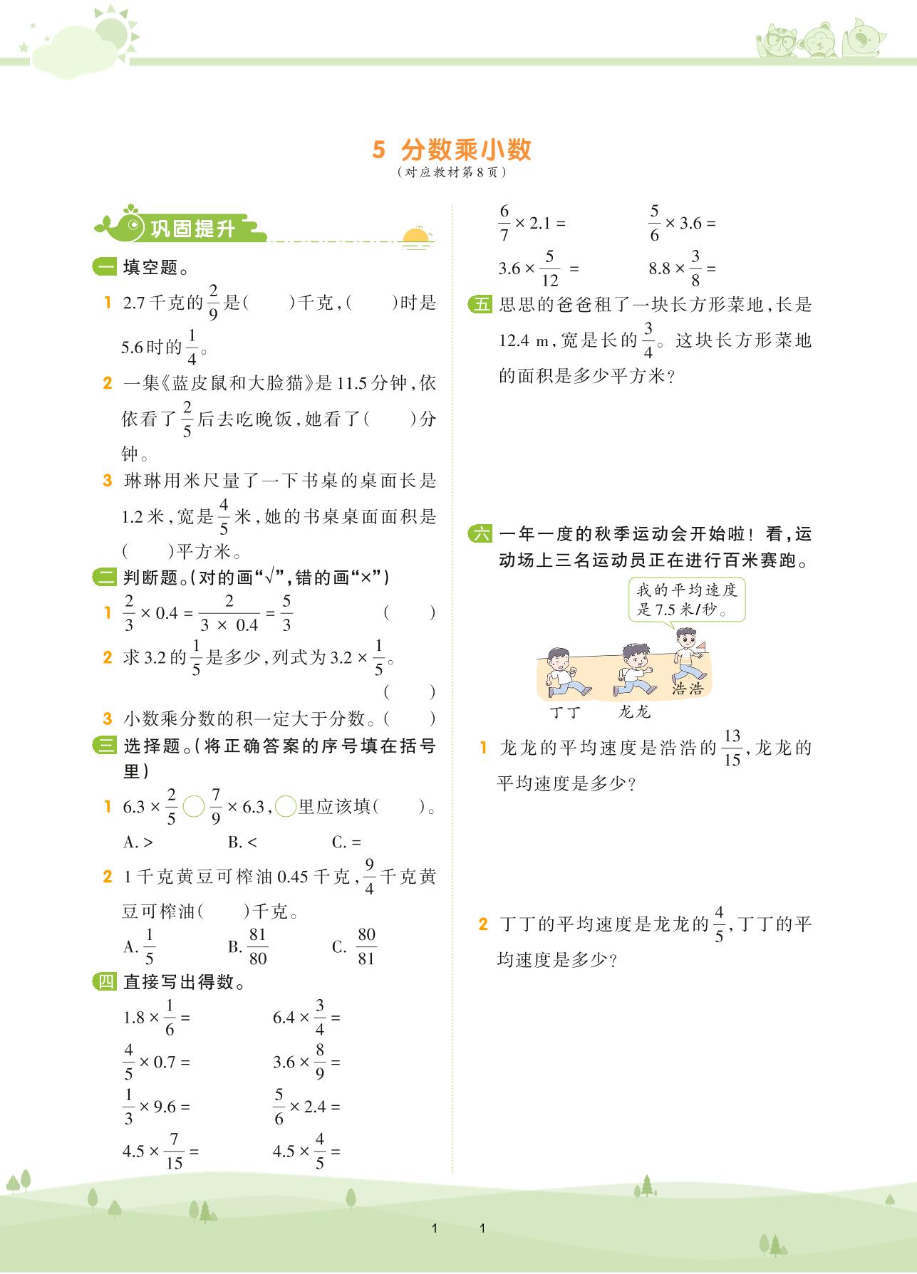 2020上册六年级数学人教版 第一单元 分数乘法——5 分数乘小数