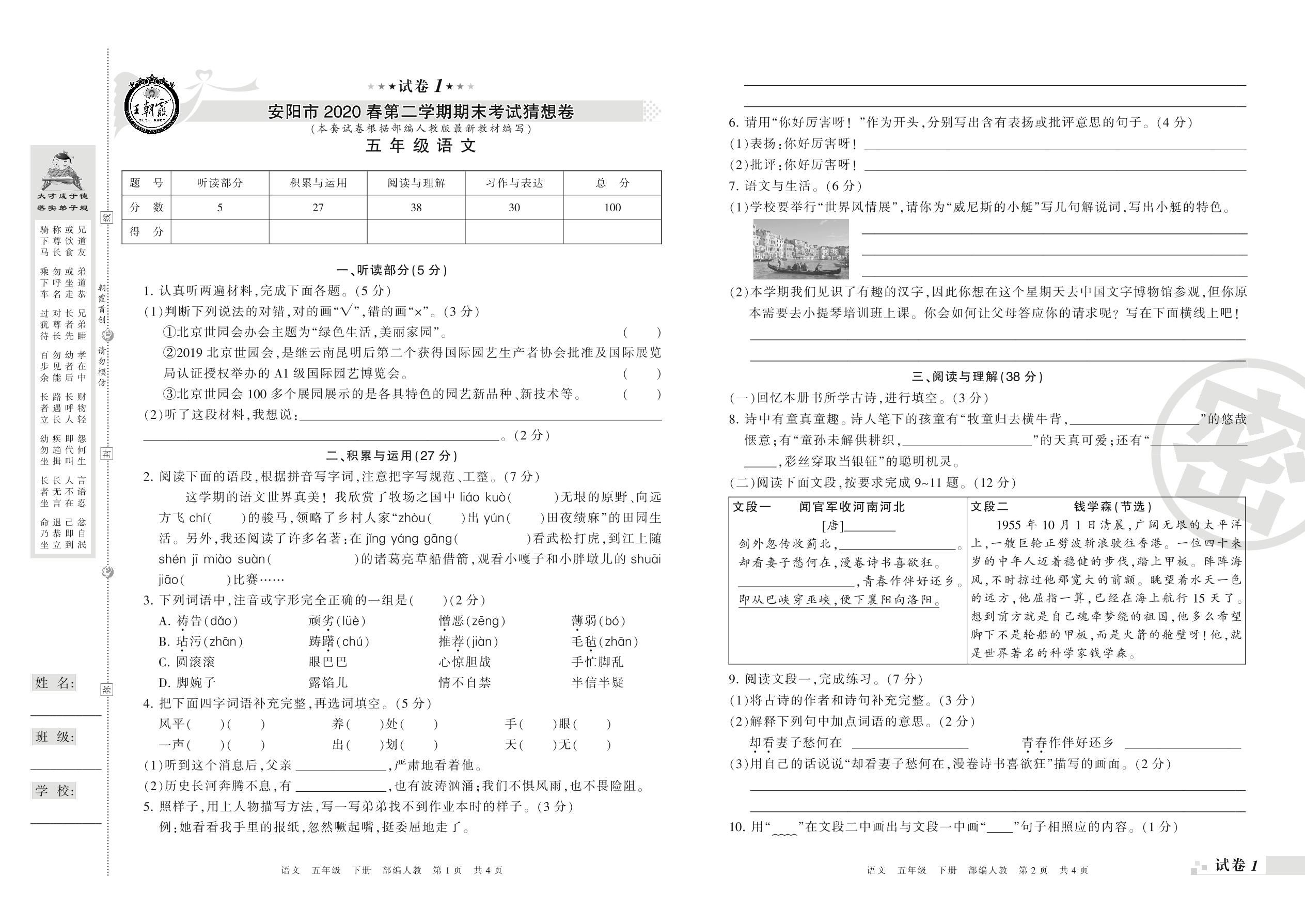 2018-2019学年第二学期安阳市猜想卷五年级语文试卷(人教版)【1】