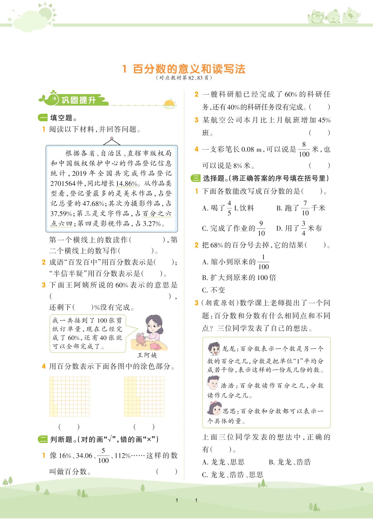 2020上册六年级数学人教版 第六单元 百分数(一)——1 百分数的意义和读写法