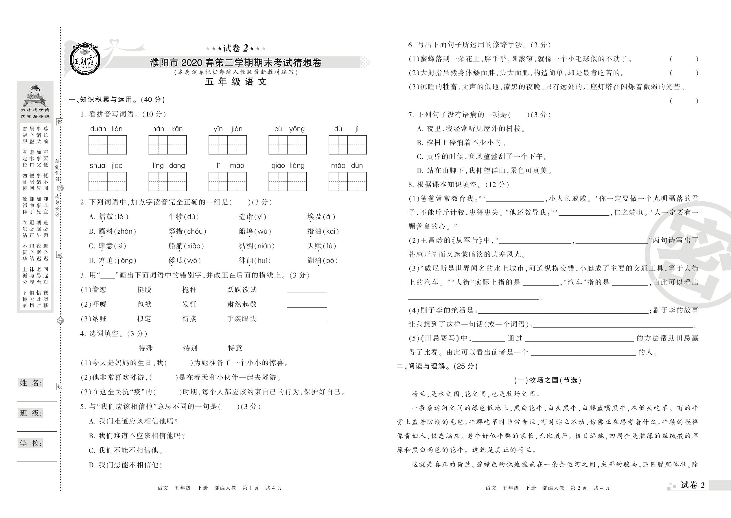 2018-2019学年第二学期濮阳市猜想卷五年级语文试卷(人教版)【2】
