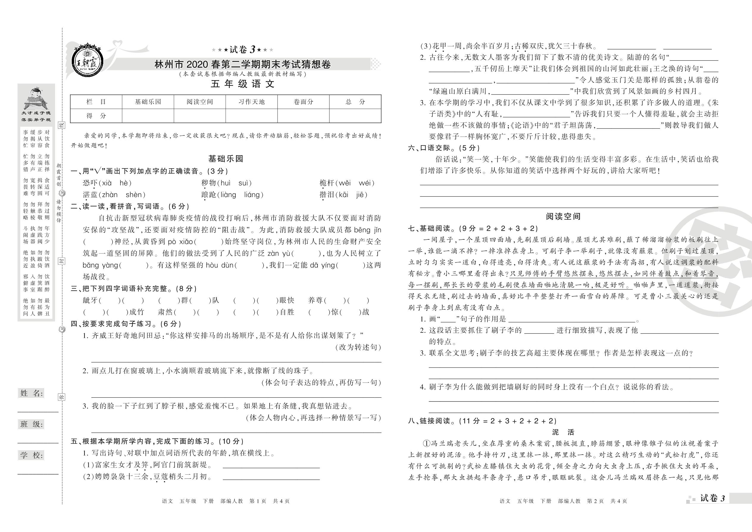 2018-2019学年第二学期林州市猜想卷五年级语文试卷(人教版)【3】