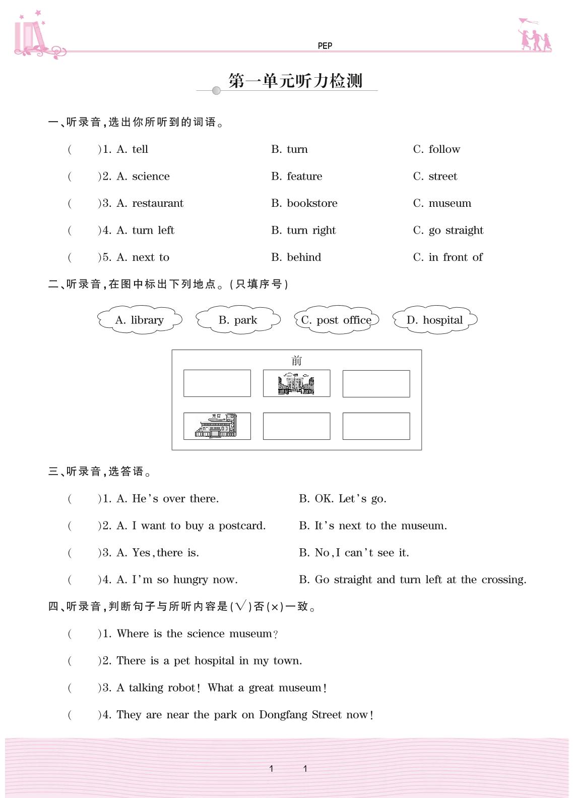 2020上册六年级英语PEP版 Unit 1 How can I get there?—第一单元听力检测