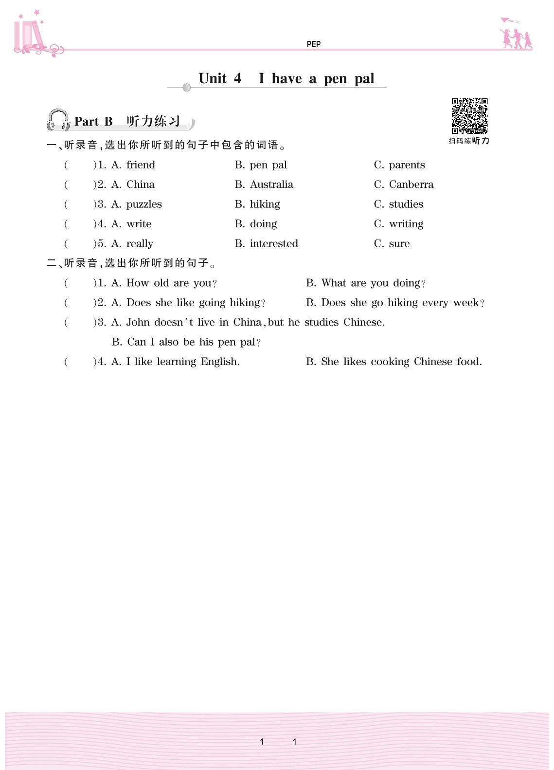 2020上册六年级英语PEP版 Unit 4 I have a pen pal—Part B听力练习