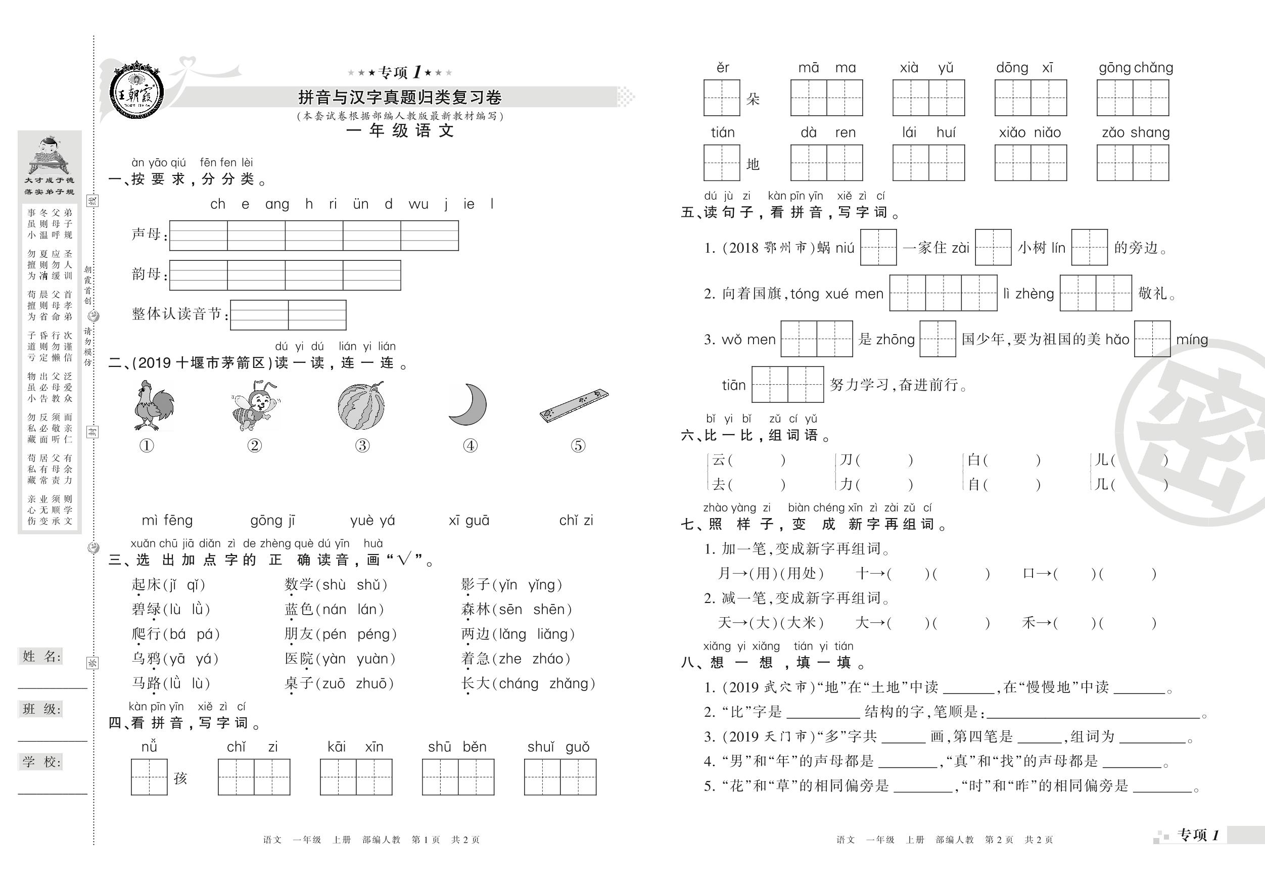 王朝霞期末专项卷——拼音与汉字、词语与句子真题归类复习卷一年级上册语文(人教版)_R210731181056【0】