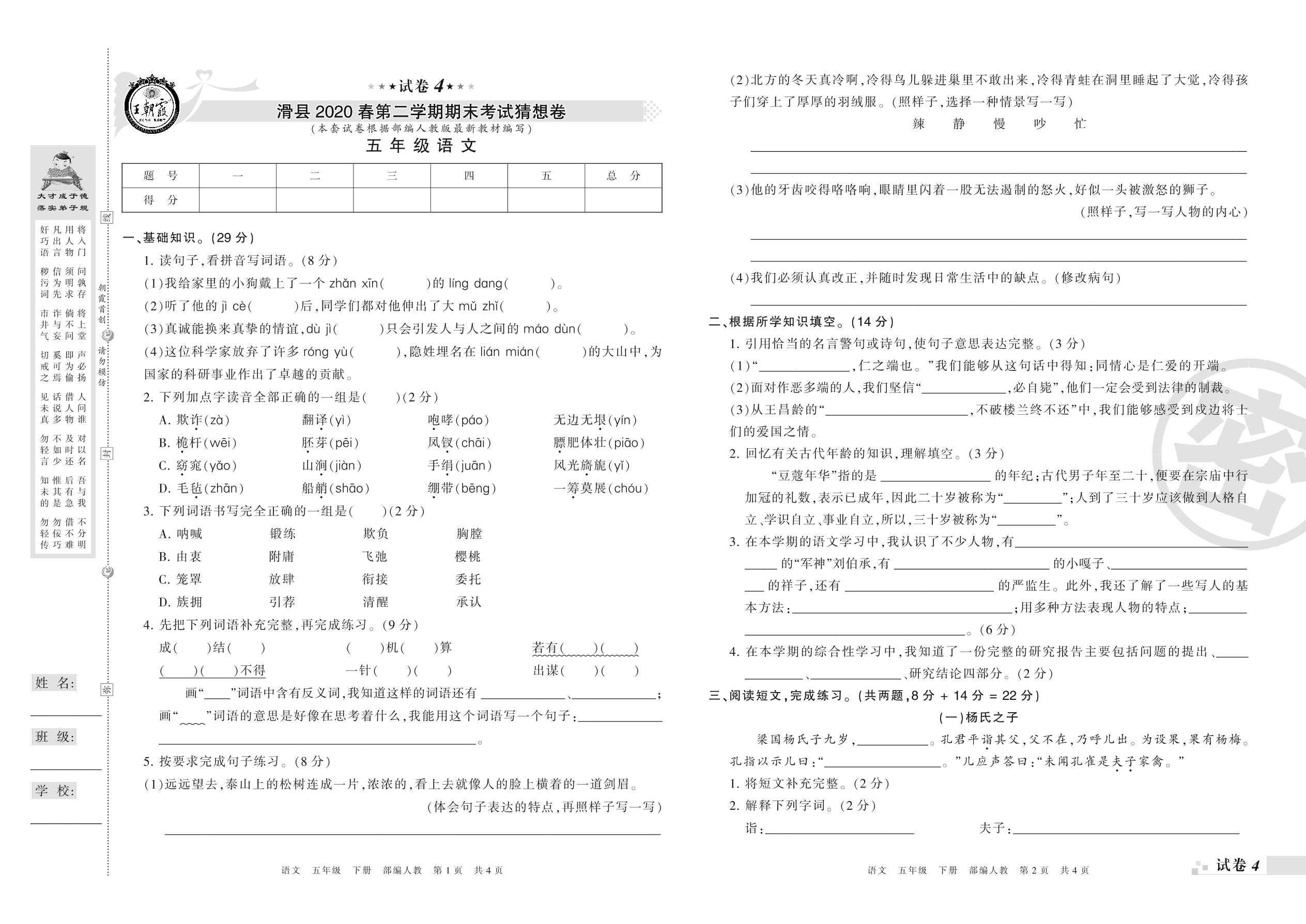 2018-2019学年第二学期安阳市滑县猜想卷五年级语文试卷(人教版)【4】