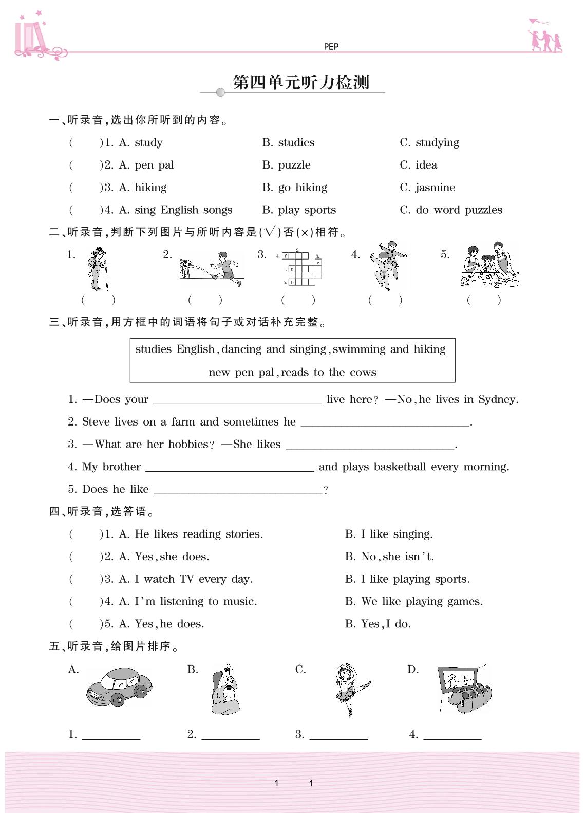 2020上册六年级英语PEP版 Unit 4 I have a pen pal—第四单元听力检测