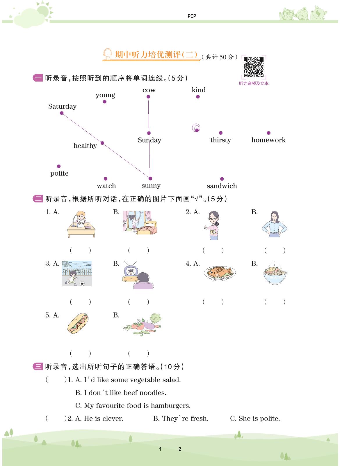 2020上册五年级英语PEP版 期中听力培优测评(二)