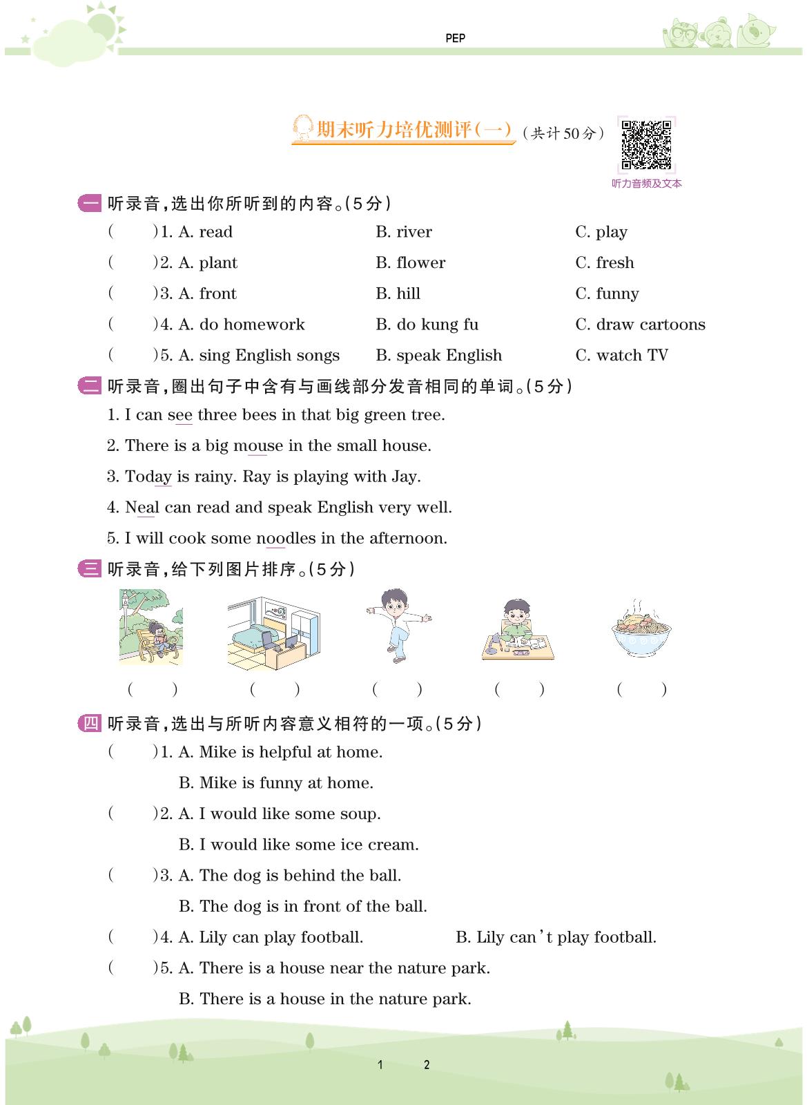 2020上册五年级英语PEP版 期末听力培优测评(一)