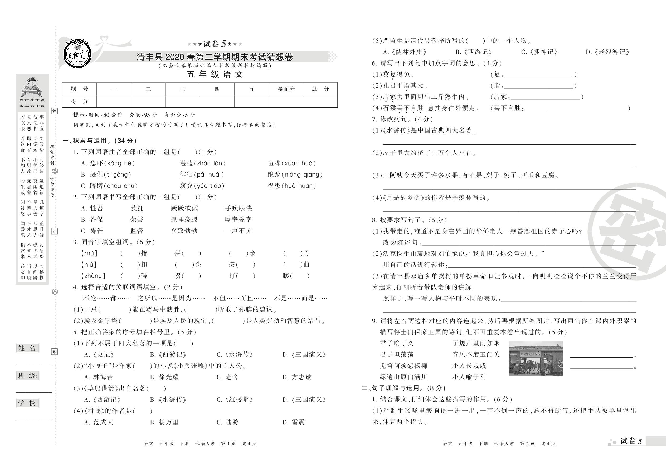 2018-2019学年第二学期濮阳市清丰县猜想卷五年级语文试卷(人教版)【5】