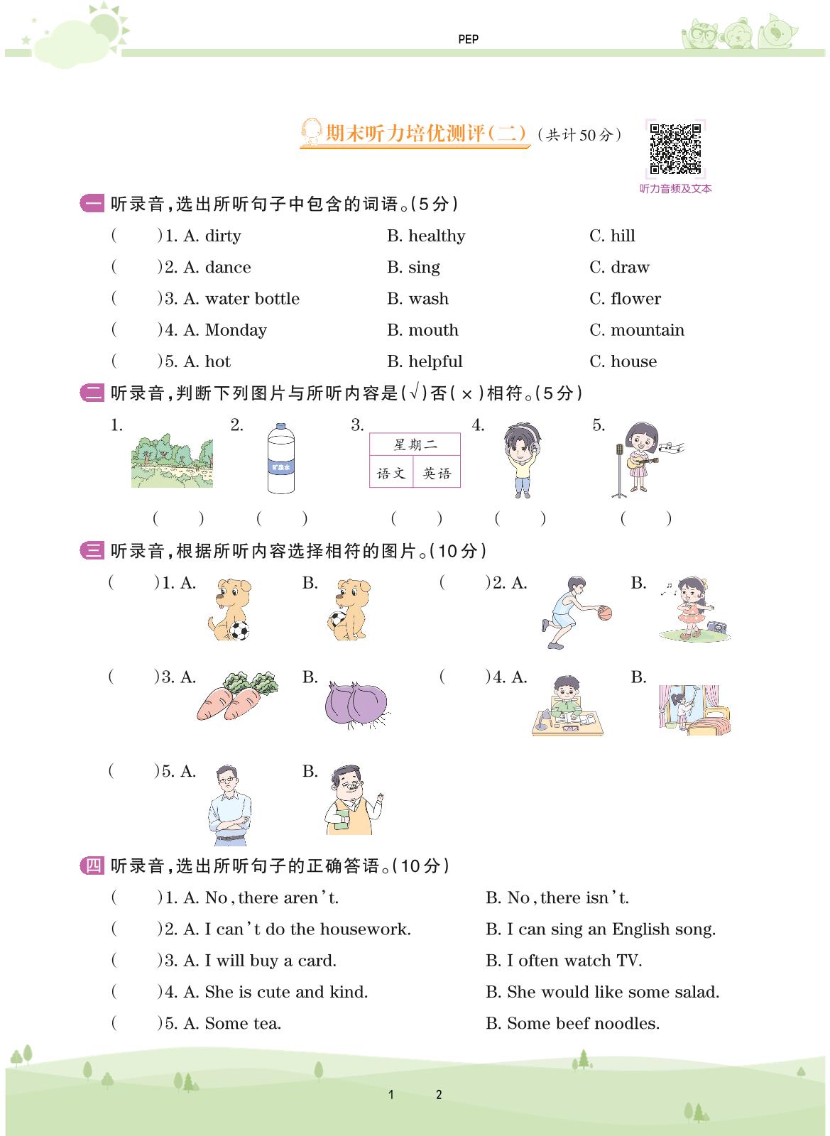 2020上册五年级英语PEP版 期末听力培优测评(二)