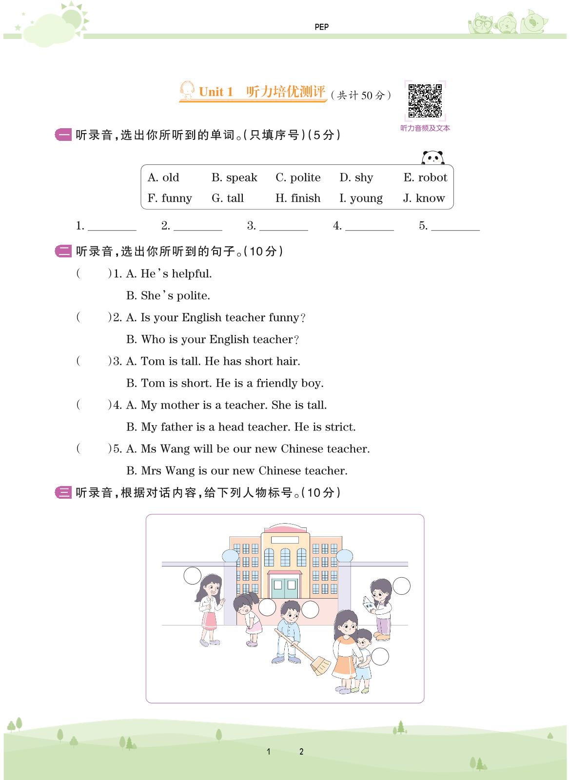 2020上册五年级英语PEP版 Unit 1 听力培优测评