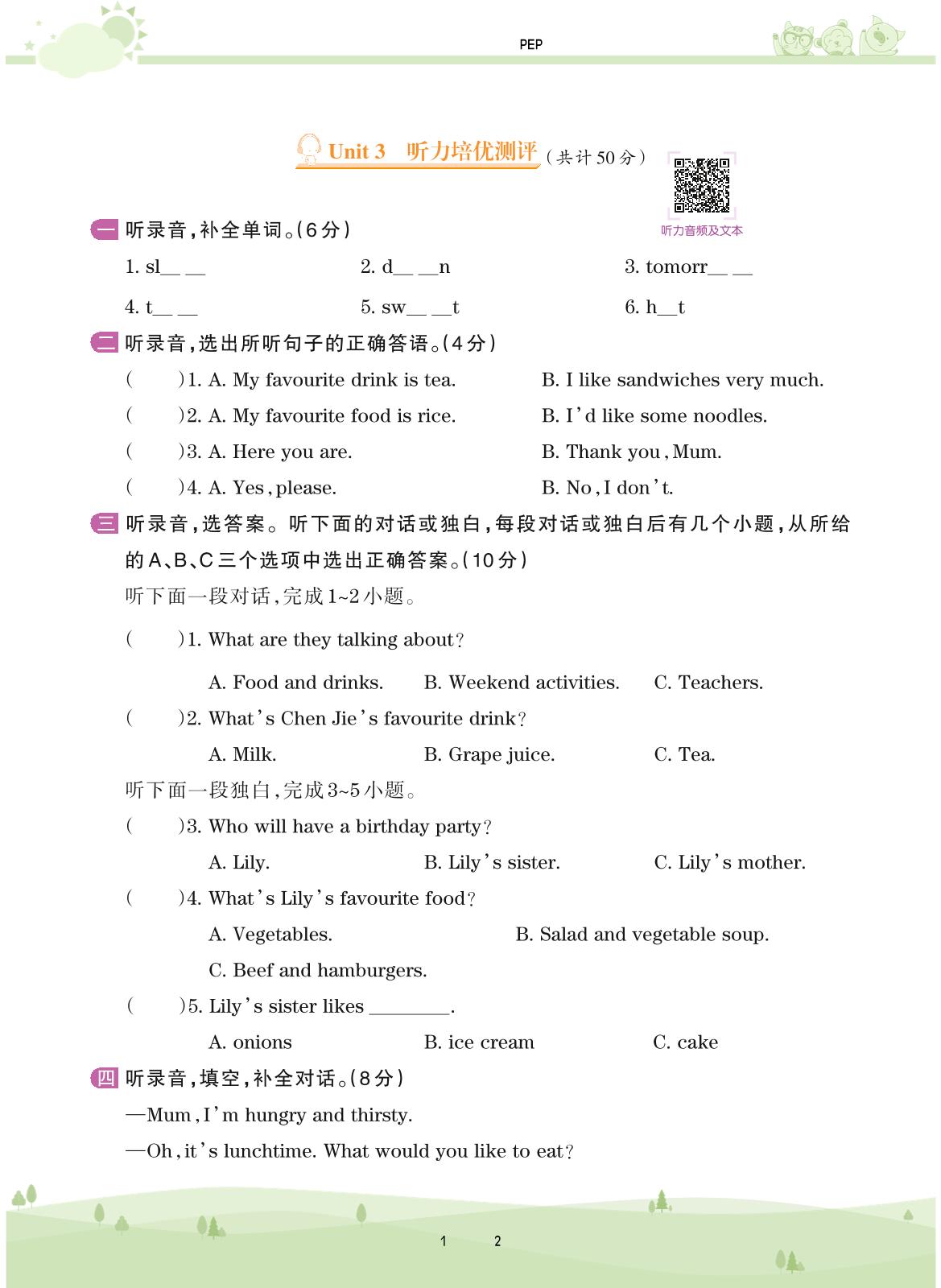 2020上册五年级英语PEP版 Unit 3 听力培优测评