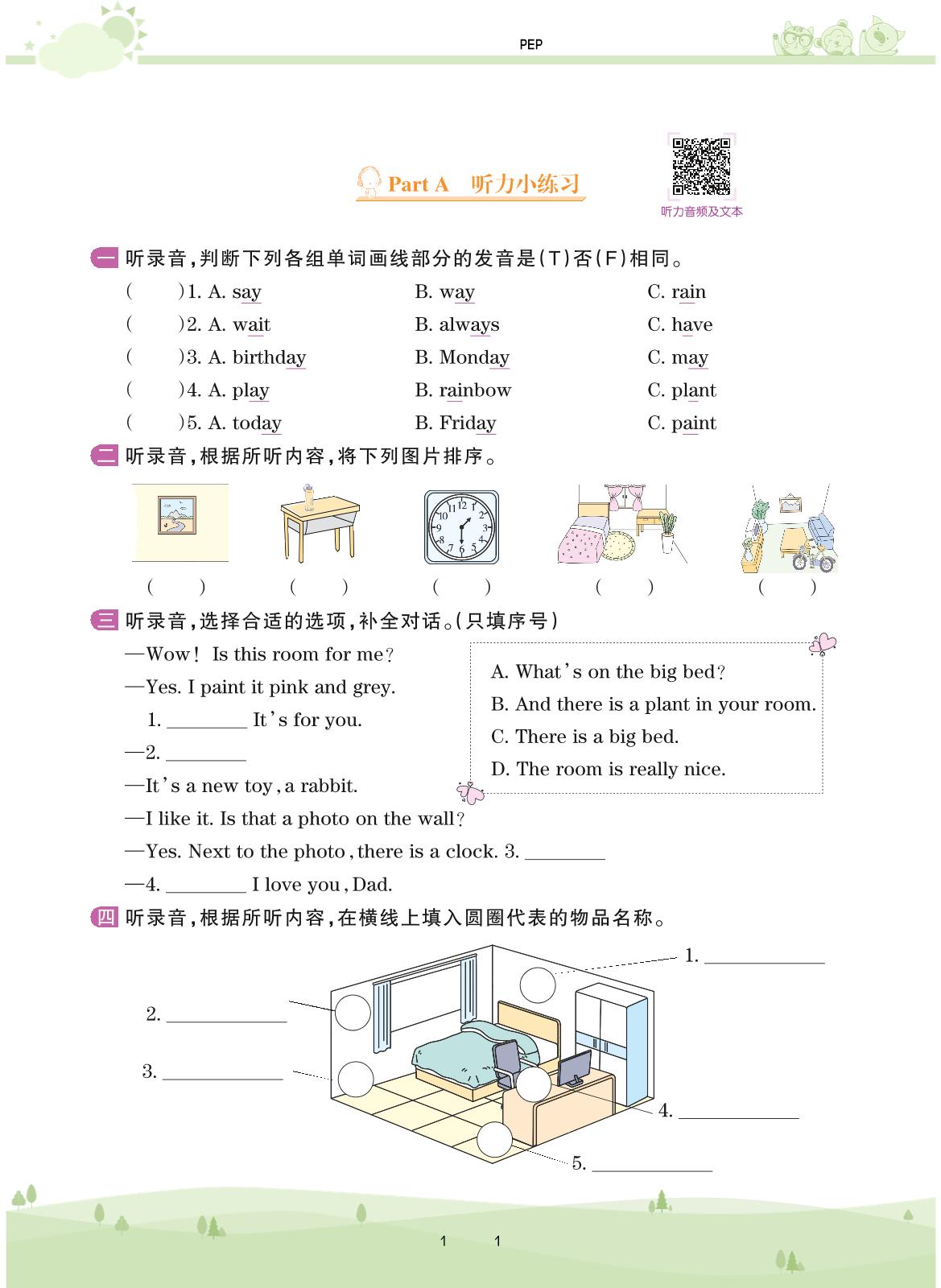 2020上册五年级英语PEP版 Unit 5 There is a big bed—Part A 听力小练习