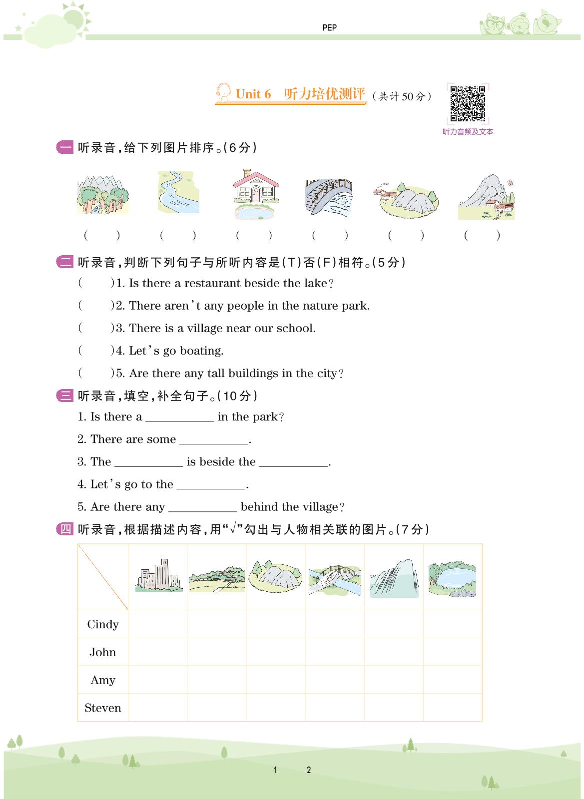 2020上册五年级英语PEP版 Unit 6 听力培优测评