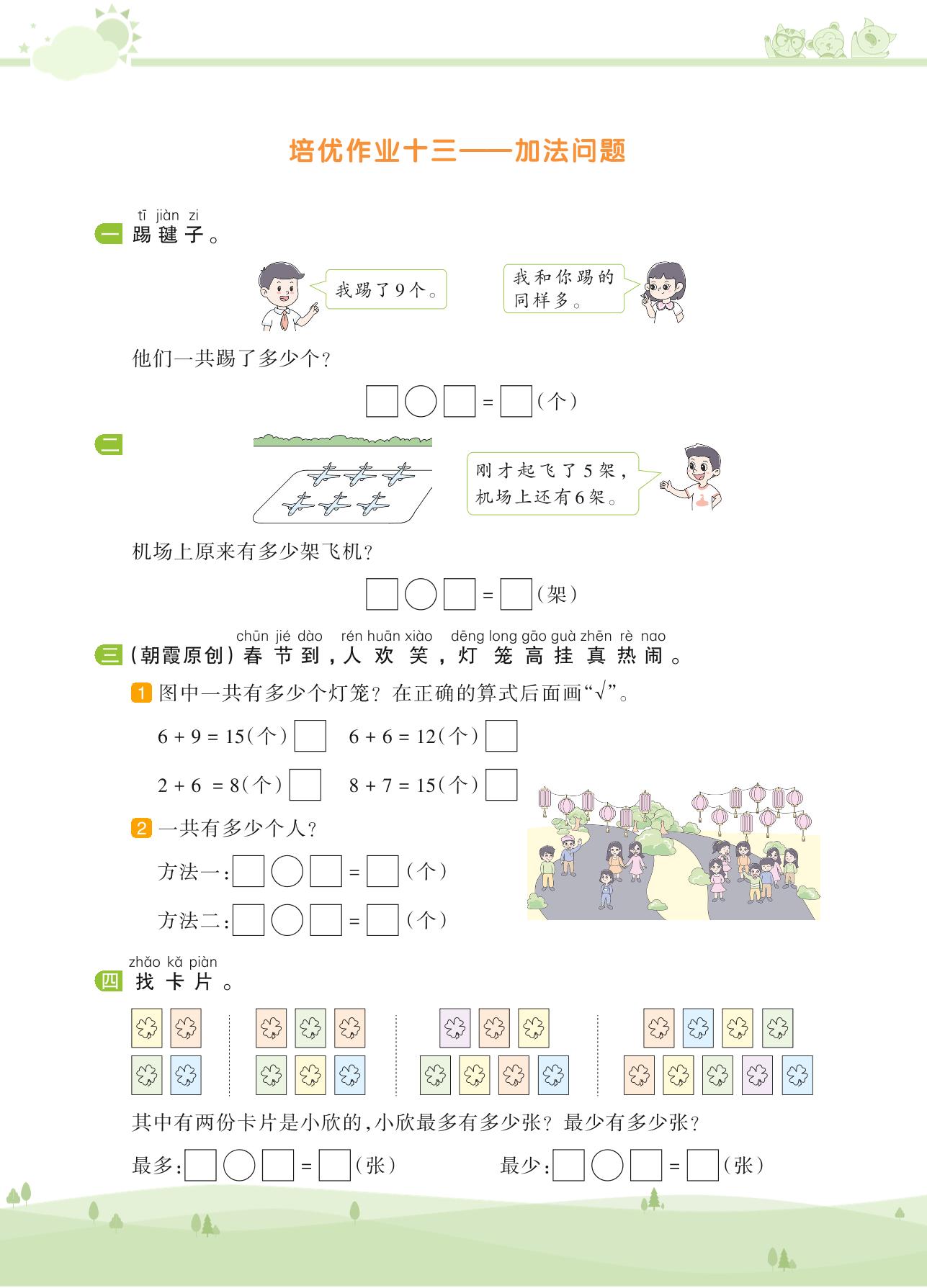 2020上册一年级数学苏教版 第十单元 20以内的进位加法——培优作业十三——加法问题