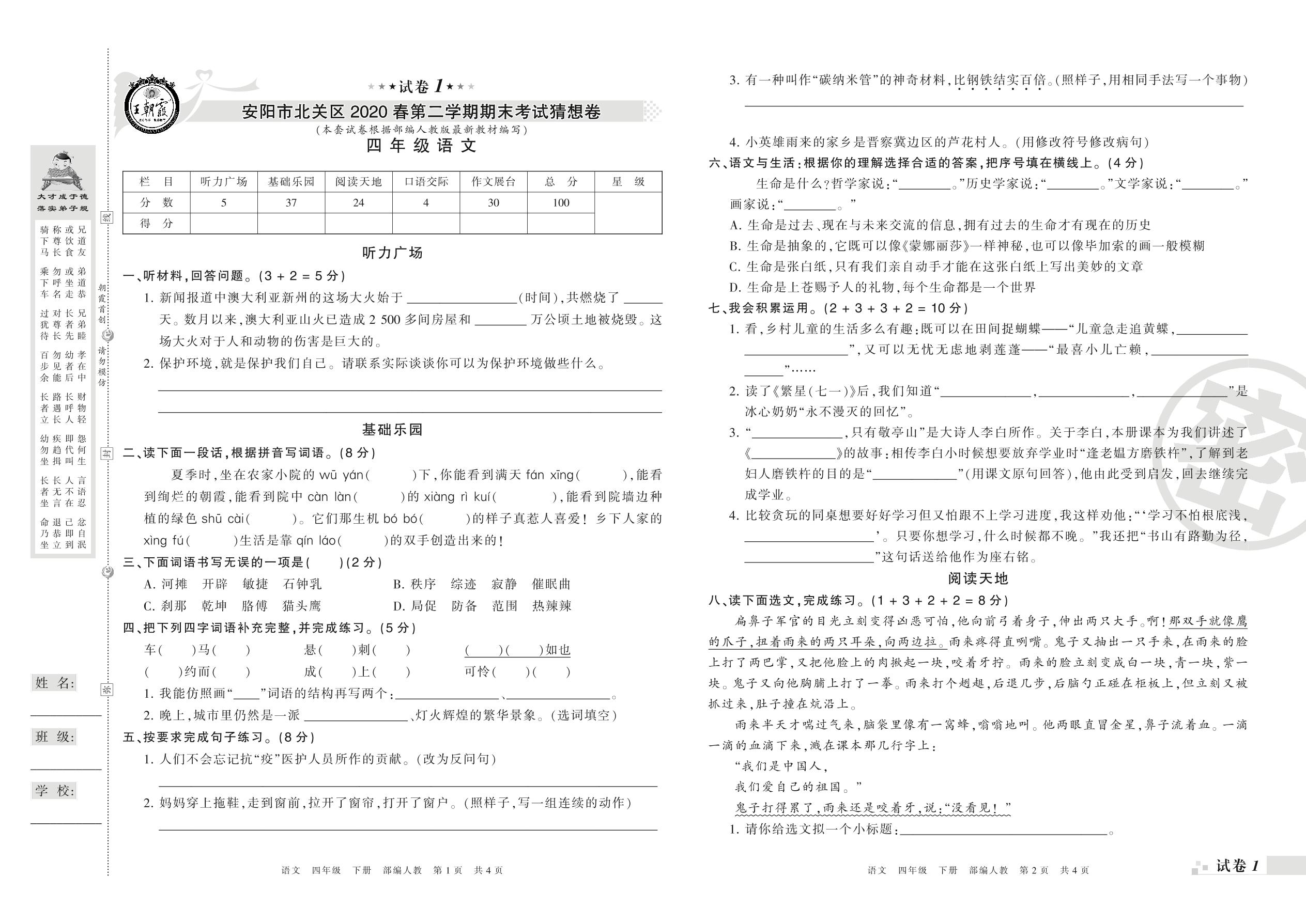 2018-2019学年第二学期安阳市北关区猜想卷四年级语文试卷(人教版)【1】