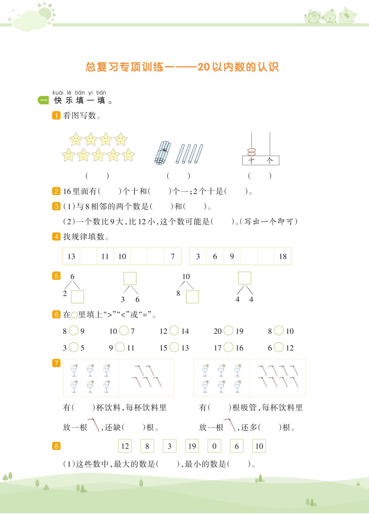 2020上册一年级数学苏教版 第十一单元 期末复习——20以内数的认识