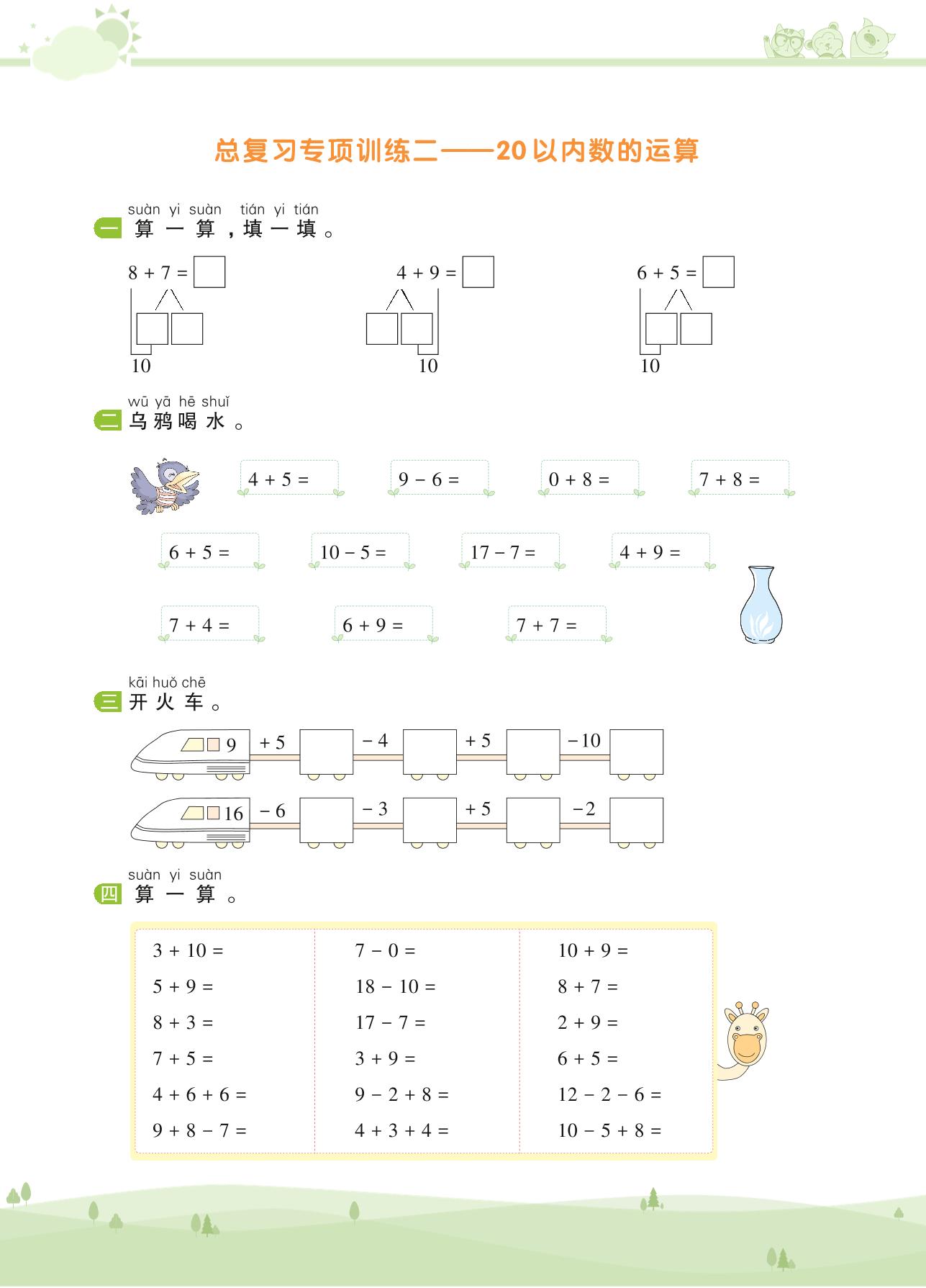 2020上册一年级数学苏教版 第十一单元 期末复习——20以内数的运算