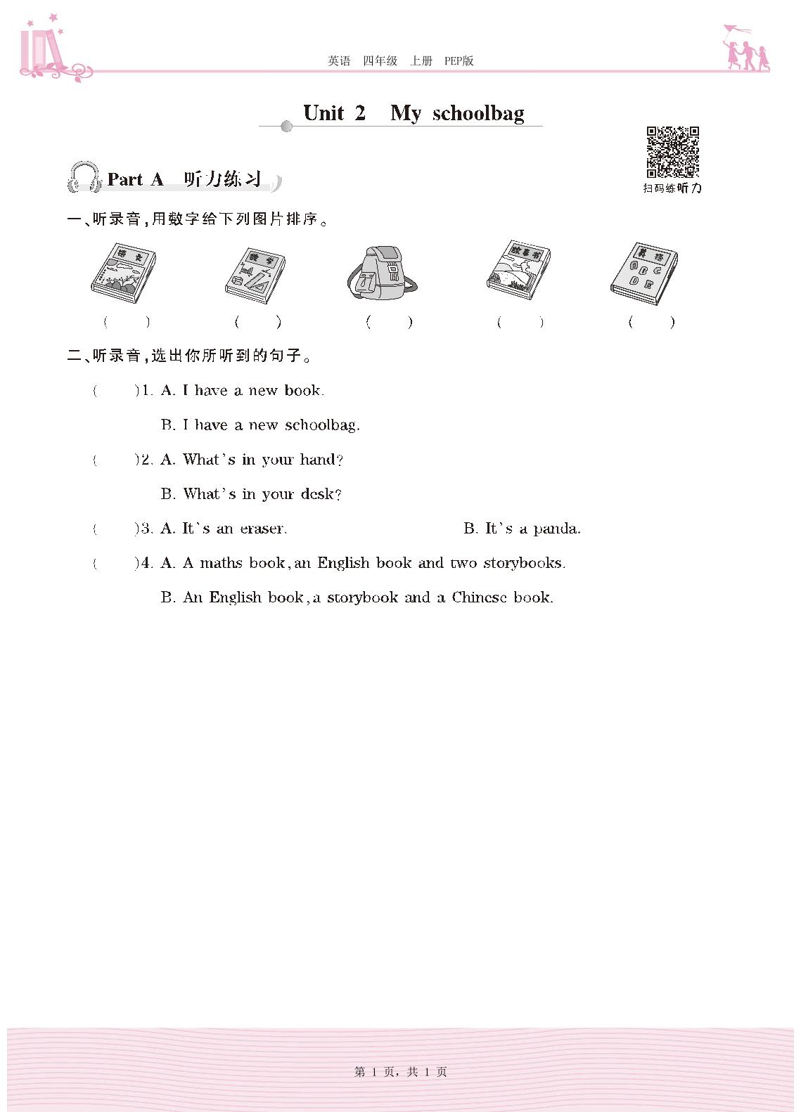 2020上册四年级英语PEP版 Unit 2 My schoolbag—Part A 听力练习