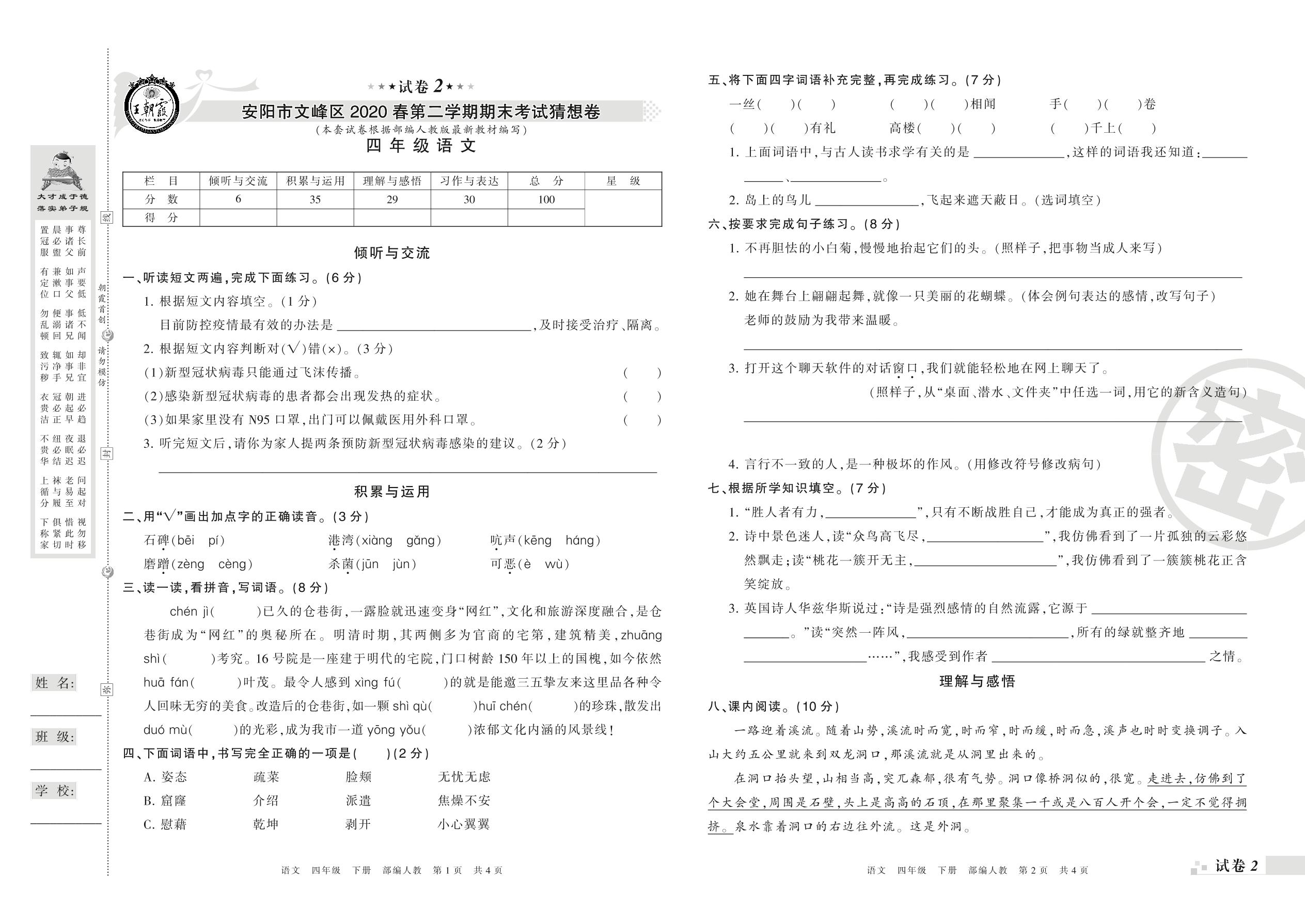 2018-2019学年第二学期安阳市文峰区猜想卷四年级语文试卷(人教版)【2】