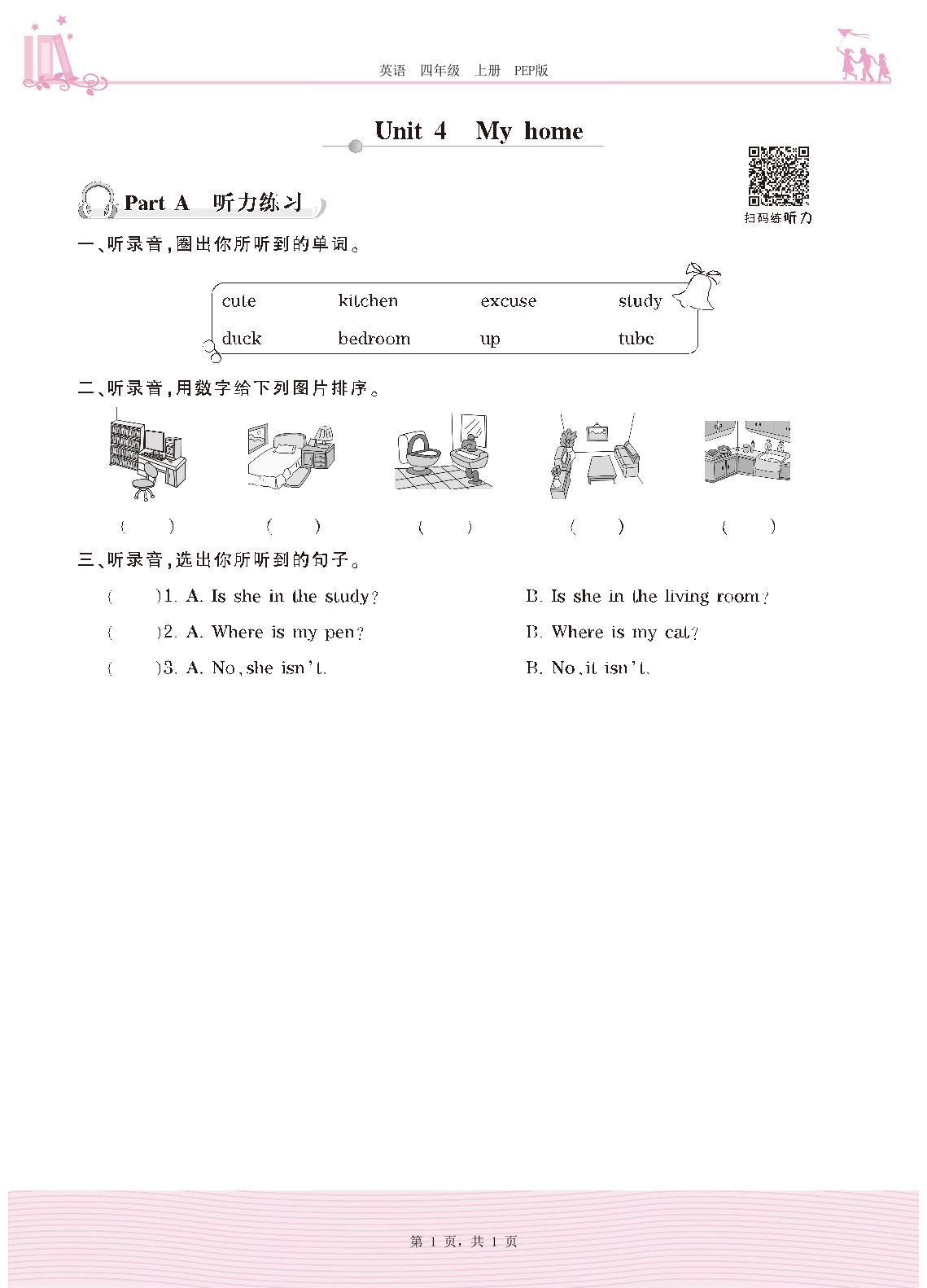 2020上册四年级英语PEP版 Unit 4 My home—Part A 听力练习