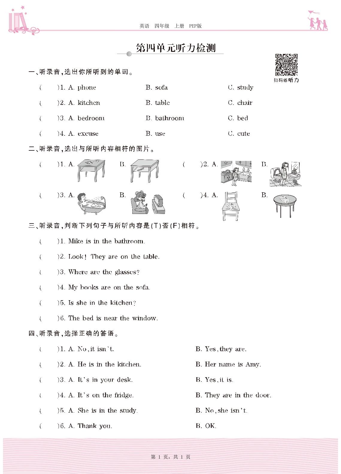 2020上册四年级英语PEP版 Unit 4 My home—第四单元听力检测