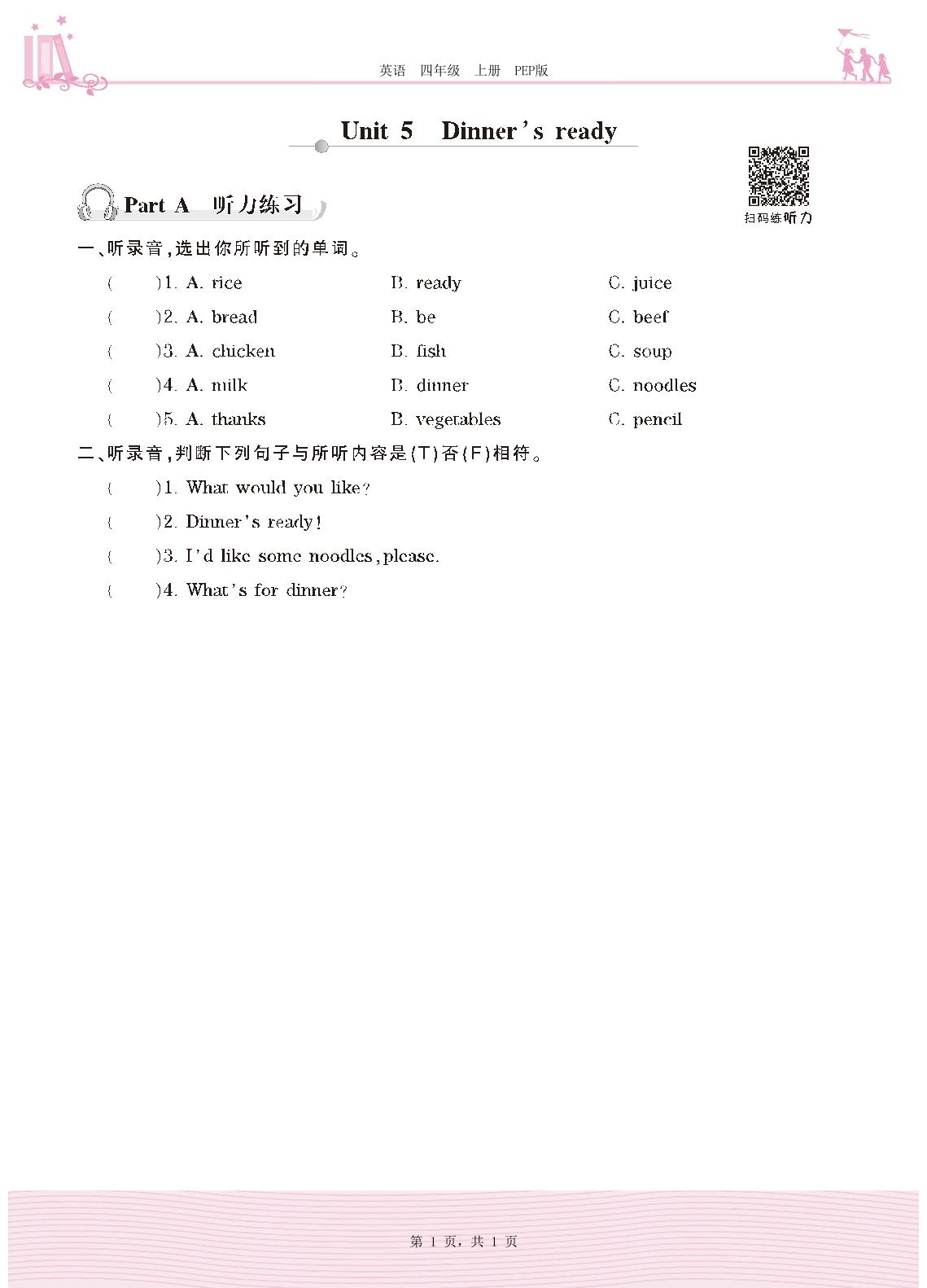 2020上册四年级英语PEP版 Unit 5 Dinner’s ready—Part A 听力练习