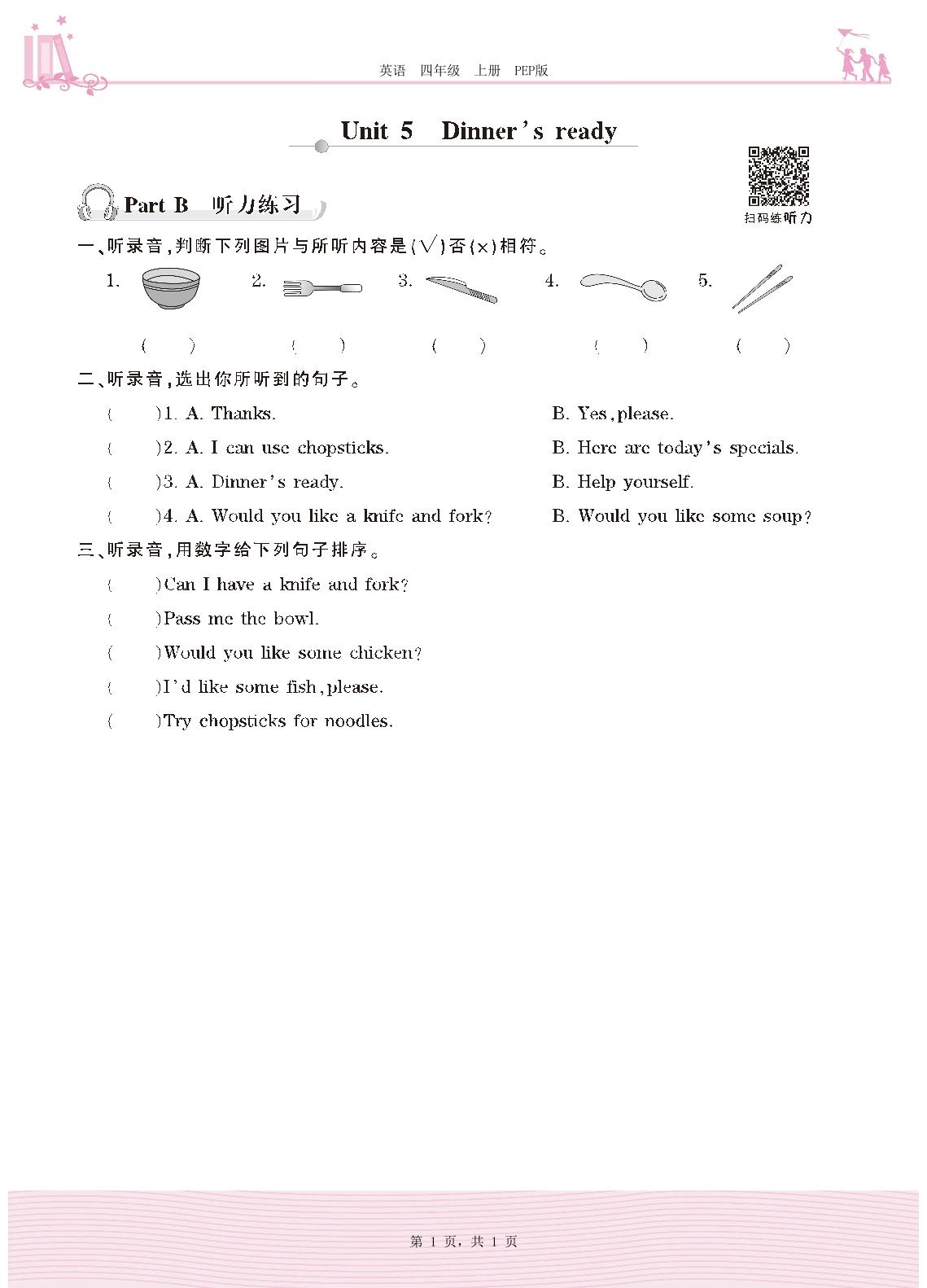 2020上册四年级英语PEP版 Unit 5 Dinner’s ready—Part B 听力练习