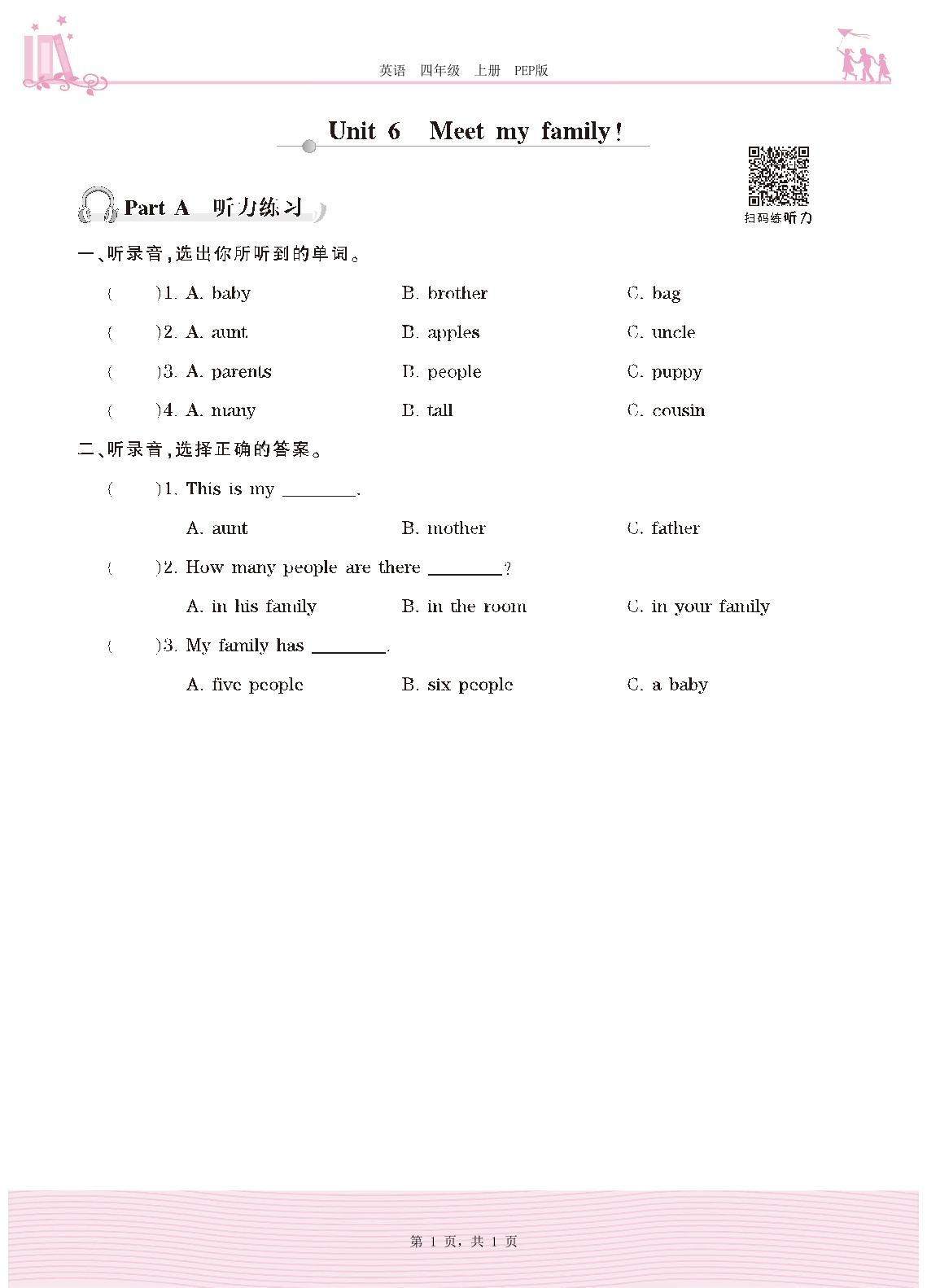 2020上册四年级英语PEP版 Unit 6 Meet my family!—Part A 听力练习