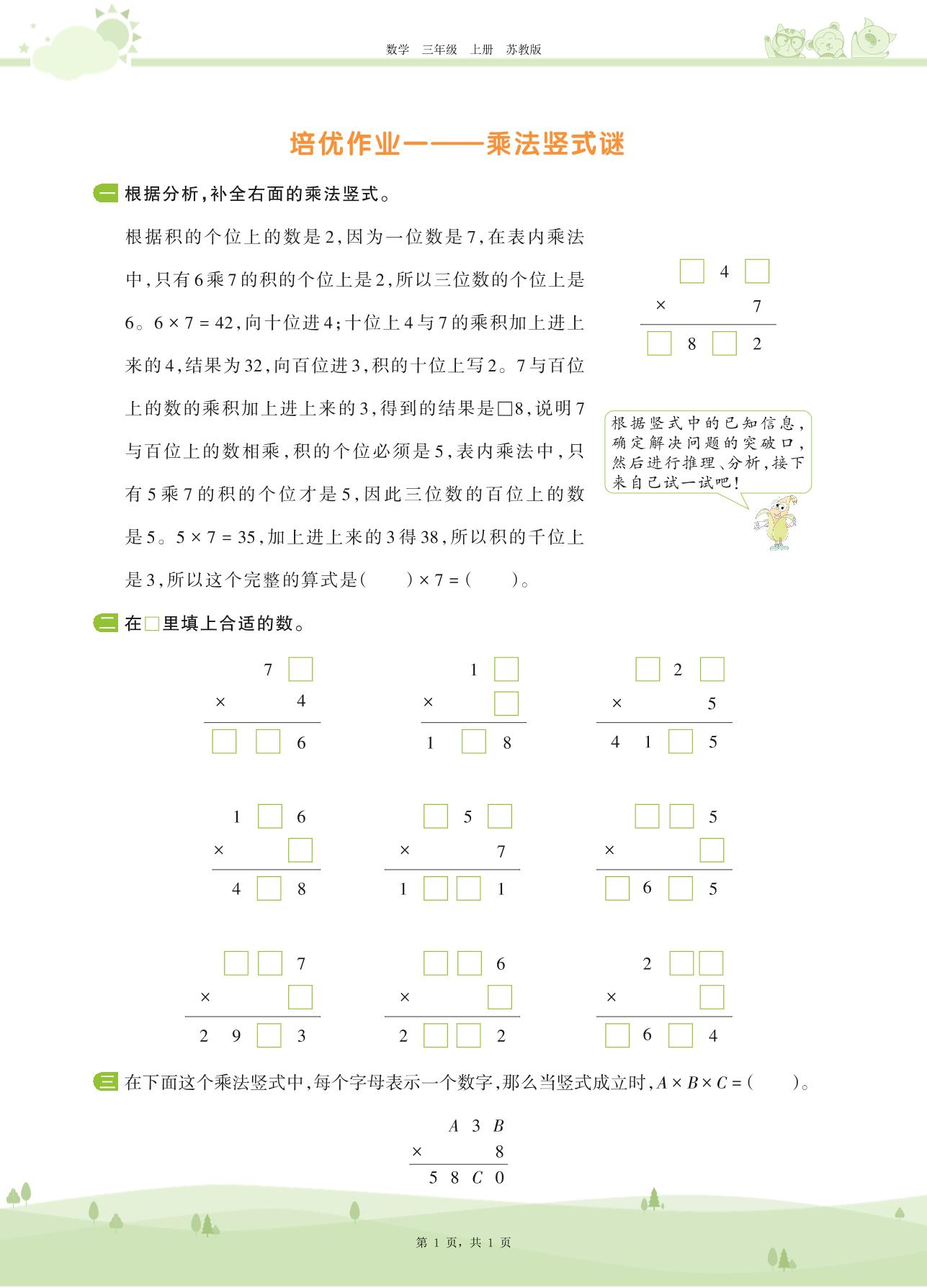 2020上册三年级数学苏教版 第一单元 两、三位数乘一位数——培优作业一 乘法竖式谜