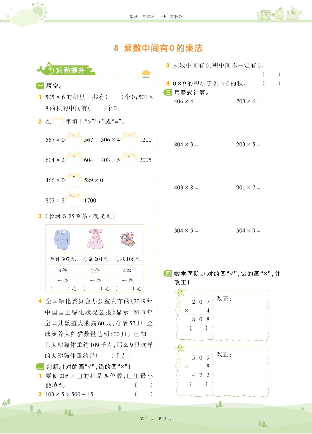 2020上册三年级数学苏教版 第一单元 两、三位数乘一位数——8 乘数中间有0的乘法