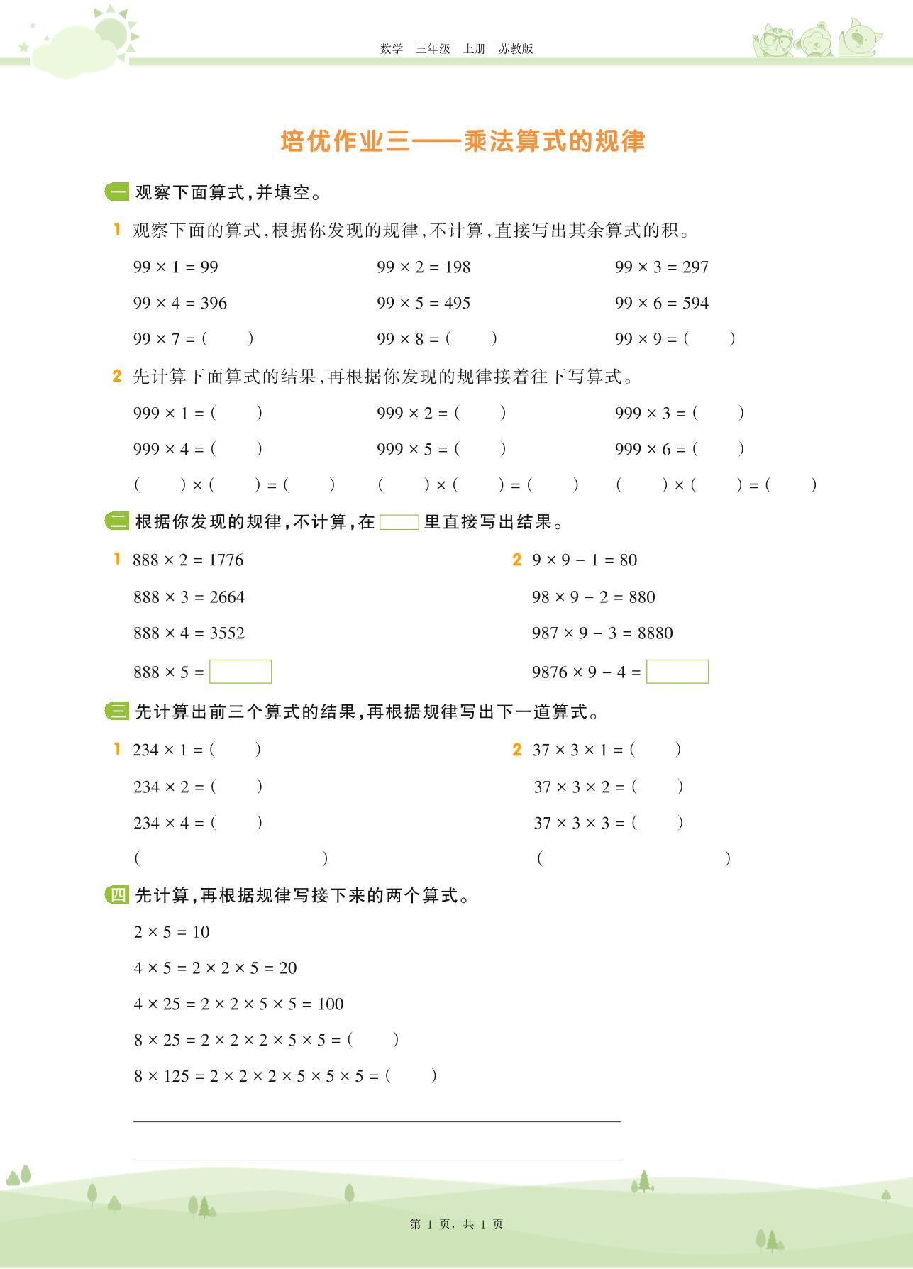 2020上册三年级数学苏教版 第一单元 两、三位数乘一位数——培优作业三 乘法算式的规律