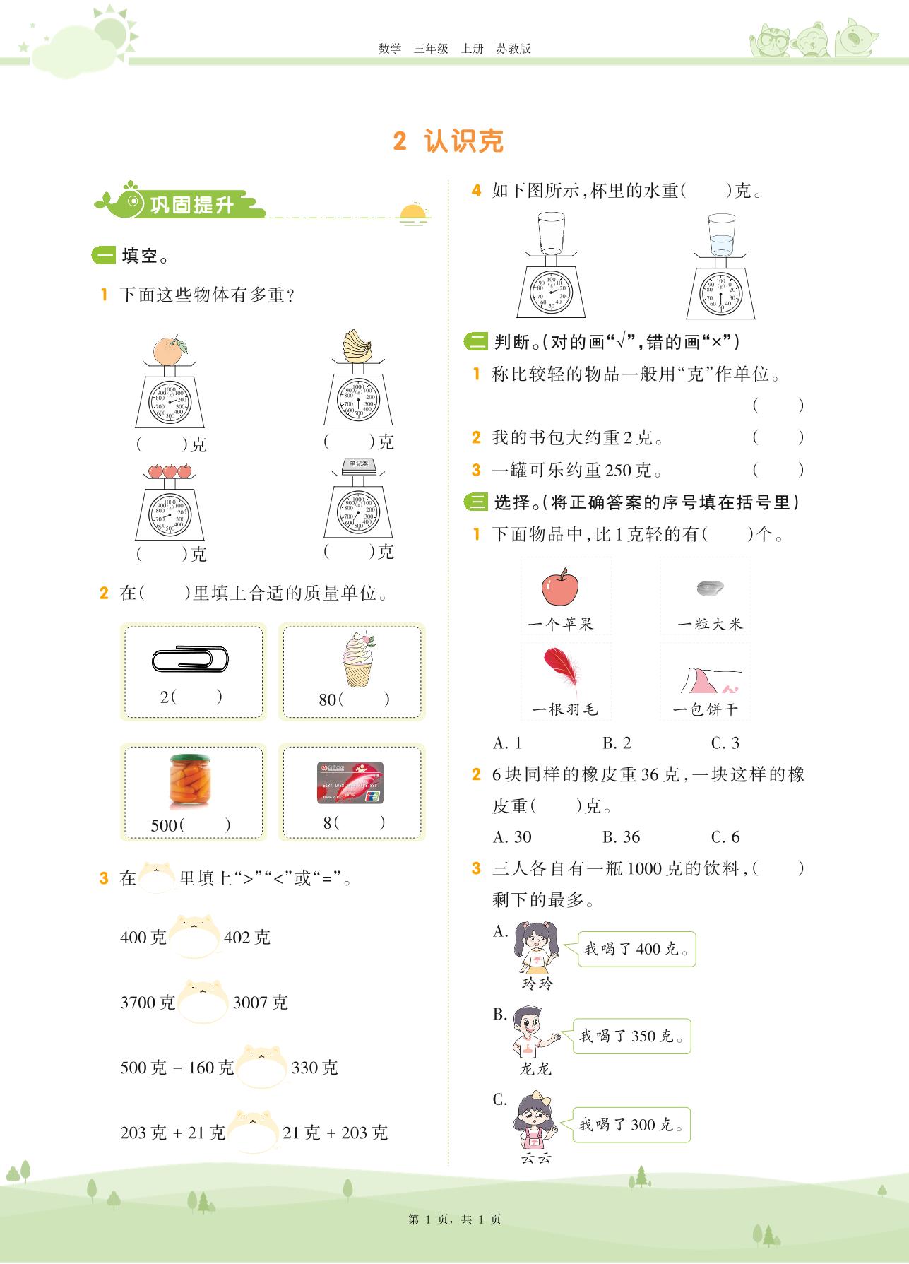 2020上册三年级数学苏教版 第二单元 千克和克——2 认识克