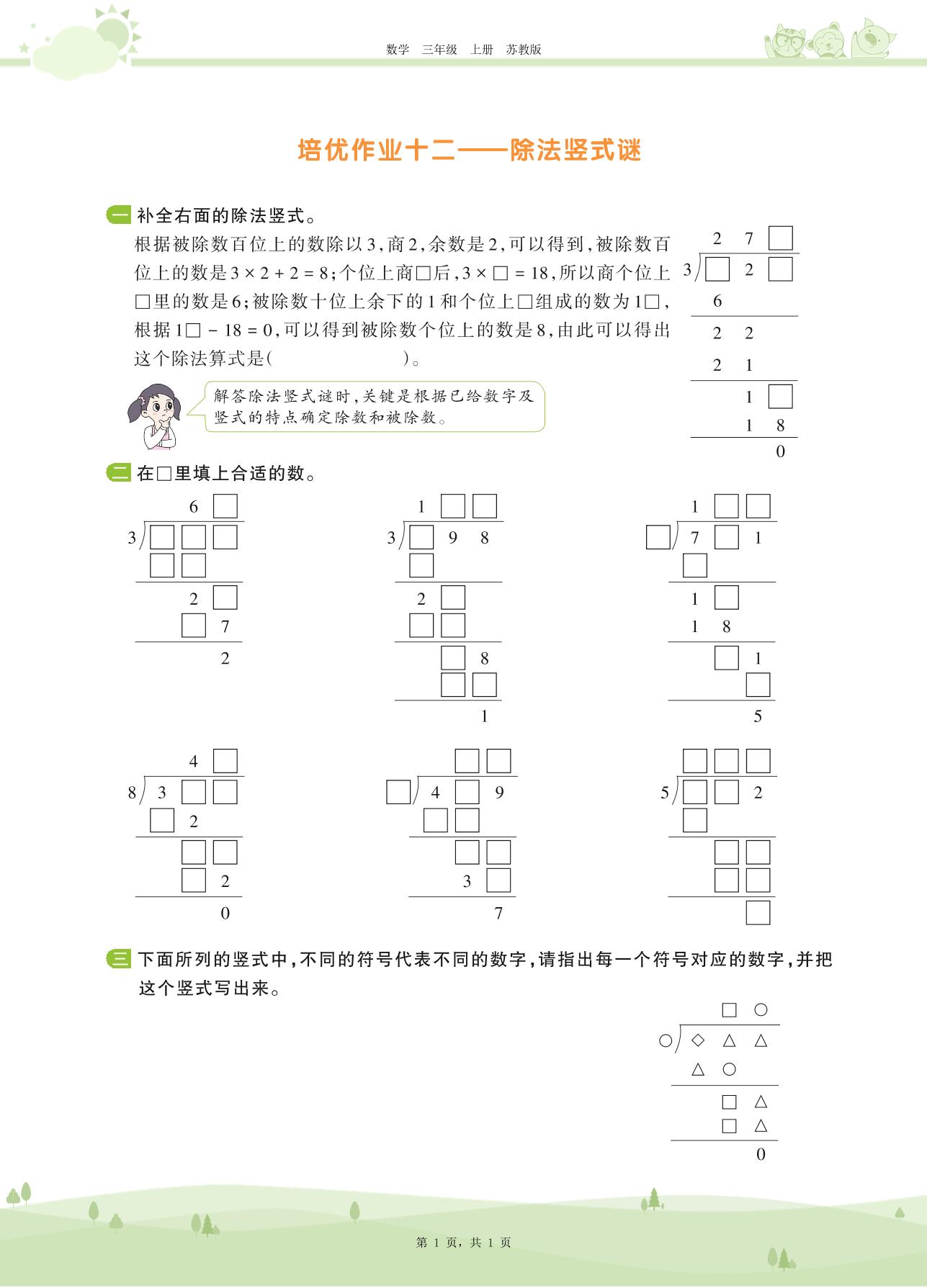 2020上册三年级数学苏教版 第四单元 两、三位数除以一位数——培优作业十二 除法竖式迷