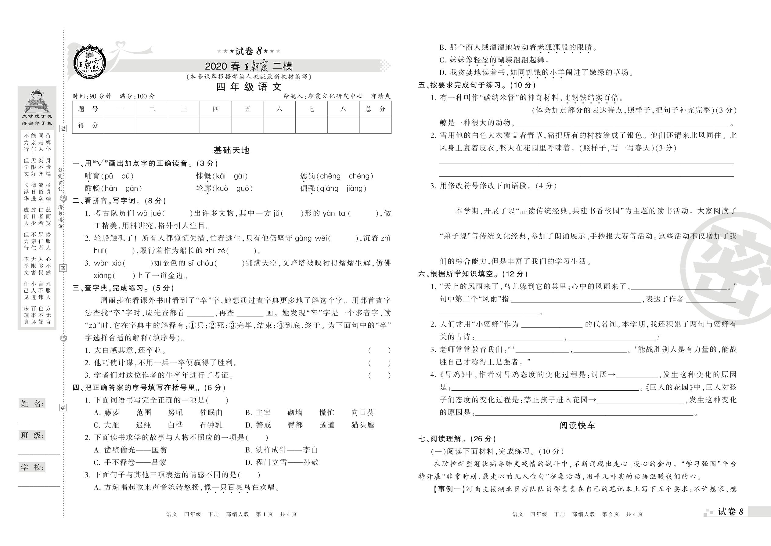 王朝霞期末模拟卷四年级下册语文(人教版)_R210801191756【8】