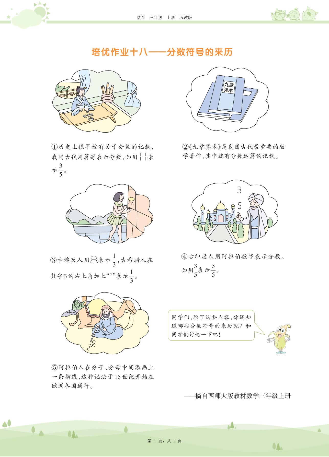 2020上册三年级数学苏教版 第七单元 分数的初步认识(一)——培优作业十八——分数符号的来历