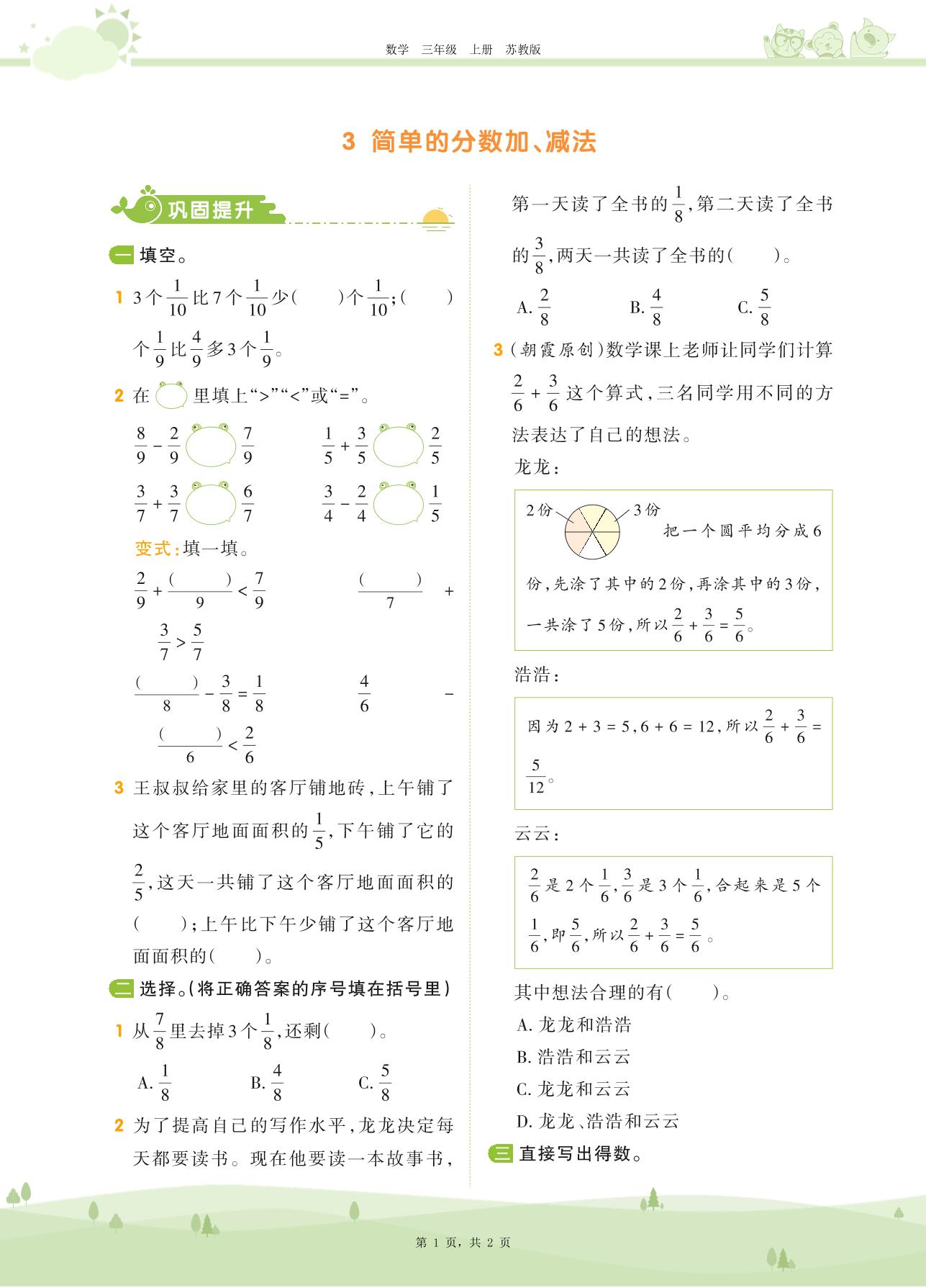 2020上册三年级数学苏教版 第七单元 分数的初步认识(一)——3 简单的分数加、减法
