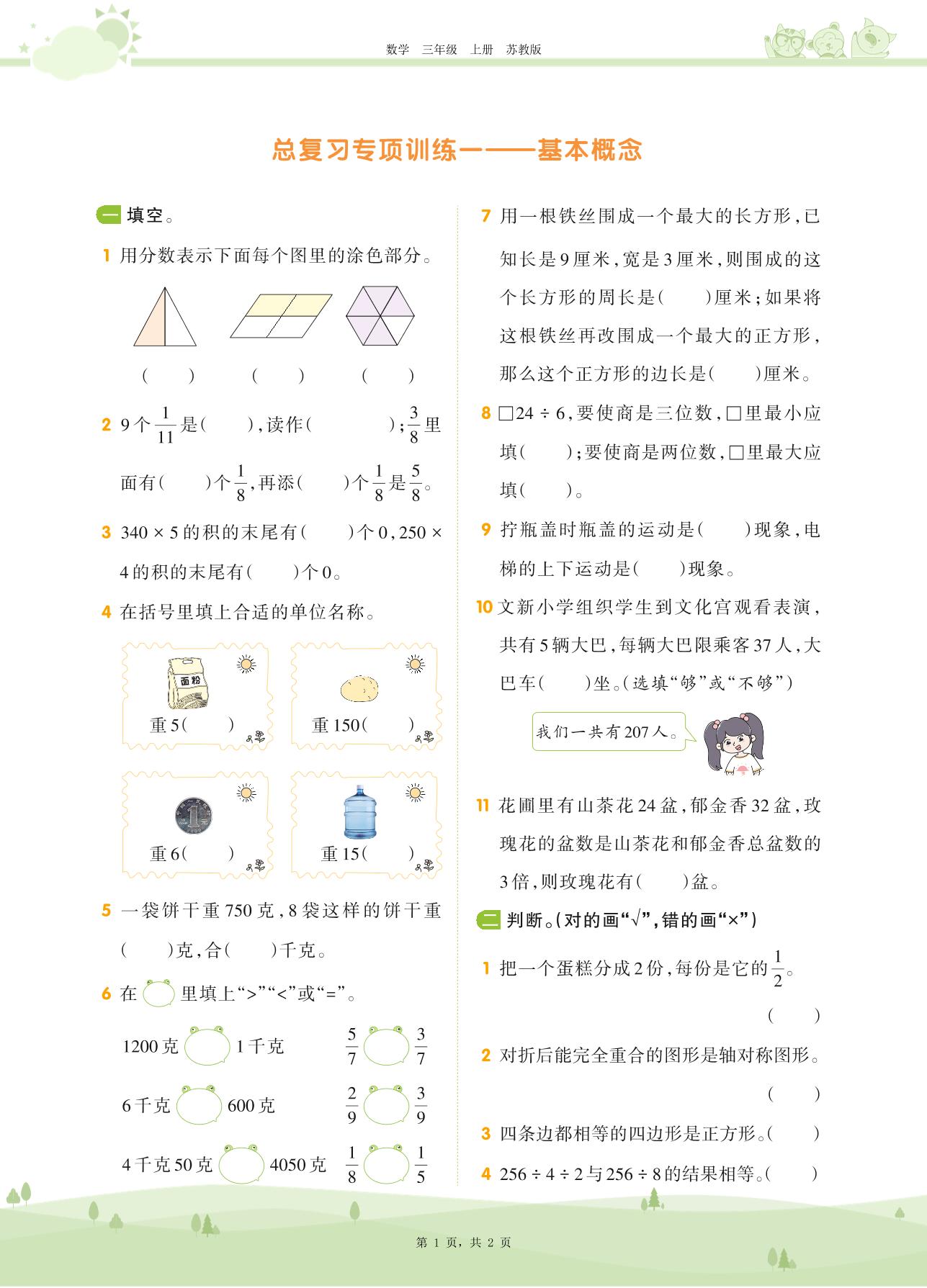 2020上册三年级数学苏教版 第八单元 期末复习——基本概念