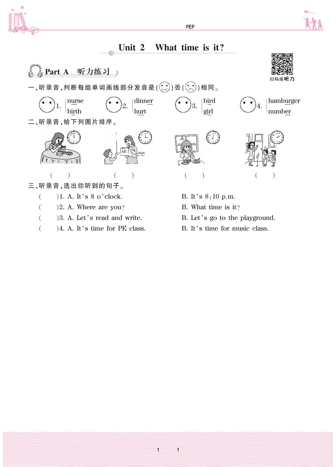 2021下册四年级英语PEP版 Unit 2 What time is it?—Part A 听力练习