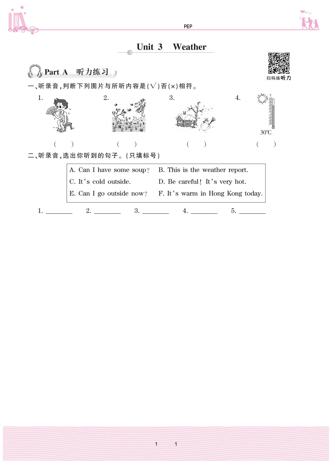 2021下册四年级英语PEP版 Unit 3 Weather—Part A 听力练习