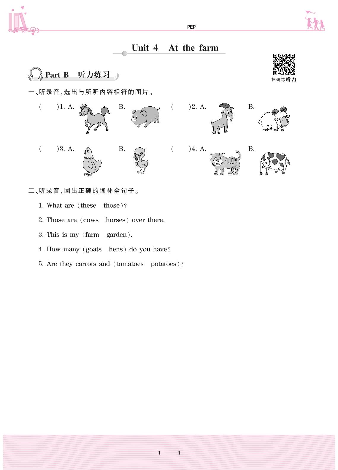 2021下册四年级英语PEP版 Unit 4 At the farm—Part B 听力练习