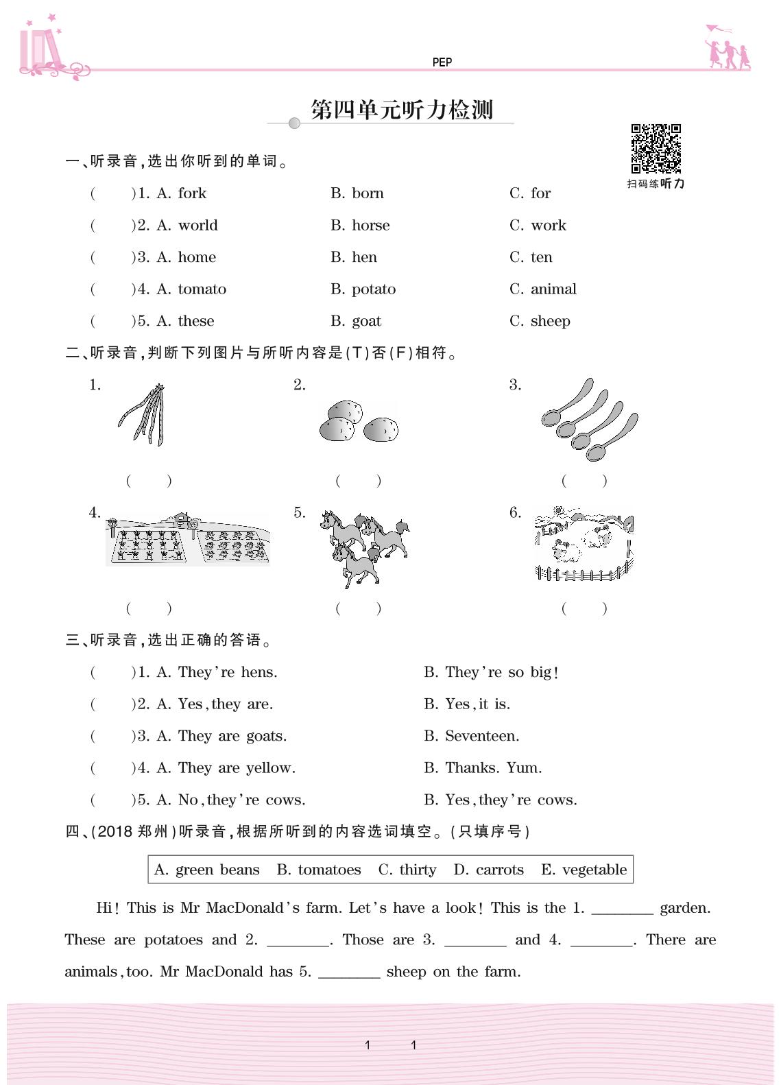 2021下册四年级英语PEP版 Unit 4 At the farm—第四单元听力检测