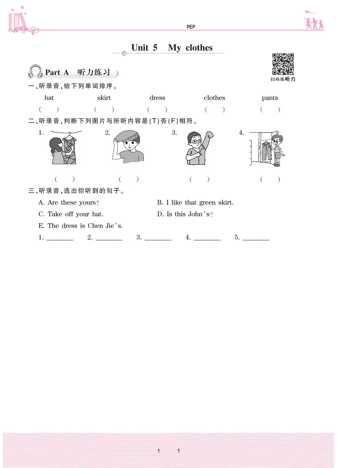 2021下册四年级英语PEP版 Unit 5 My clothes—Part A 听力练习