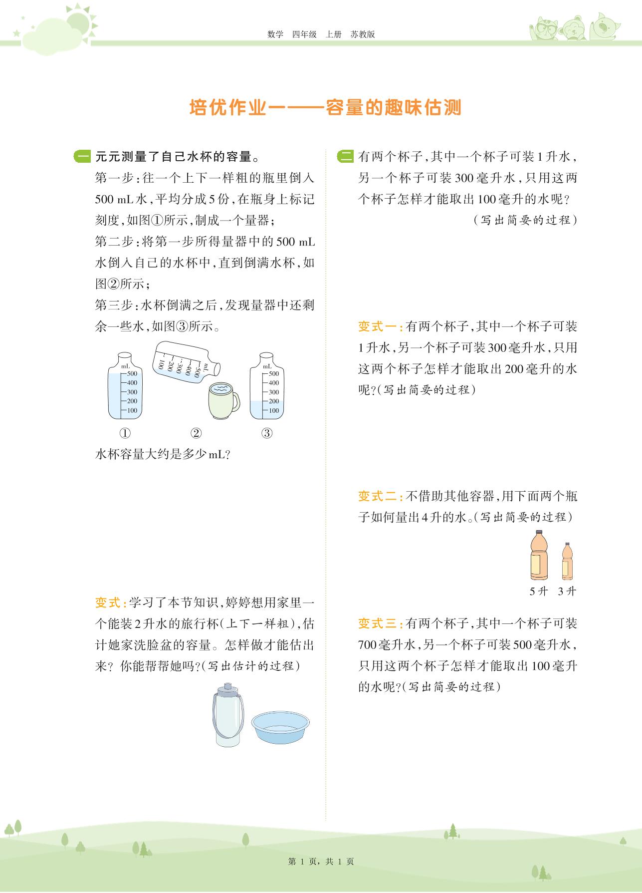 2020上册四年级数学苏教版 第一单元 升和毫升——培优作业一——容量的趣味估测