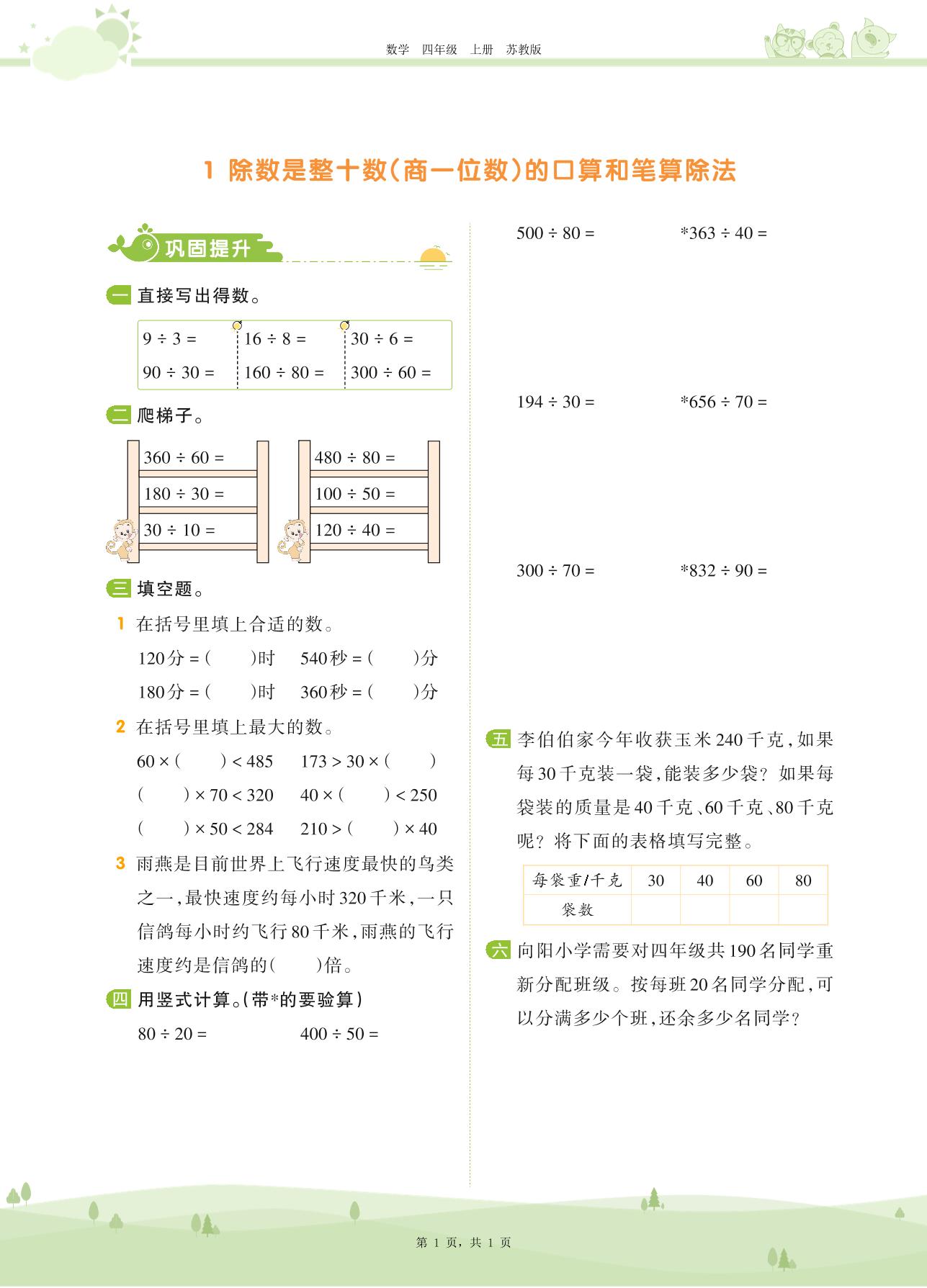 2020上册四年级数学苏教版 第二单元 两、三位数除以两位数——1 除数是整十数(商一位数)的口算和笔算除法
