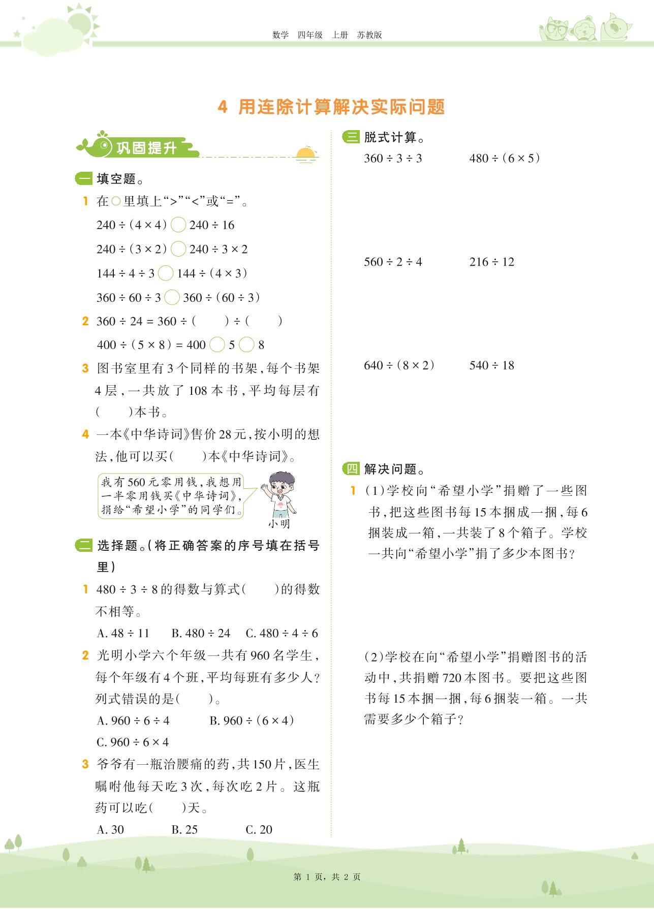 四年级数学苏教版上册课时作业